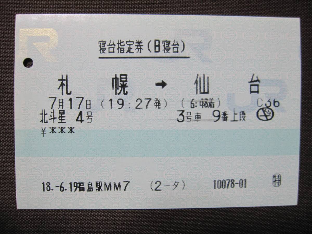 【使用済】 北斗星 寝台指定券(B寝台) JR東日本 北斗星4号 札幌 ⇒ 仙台 3号車9番上段 H18.7.17 H18.6.19 福島駅発行 経年による多少のヤケ、自動改札を通した際のスレがみられます。 あくまで中古品扱いですので画像でご確認いただける範囲で了解いただける方のみお願いいたします。 完璧な状態をお求めの方は入札ご遠慮ください。ノークレーム・ノーリターンでお願いします。 |