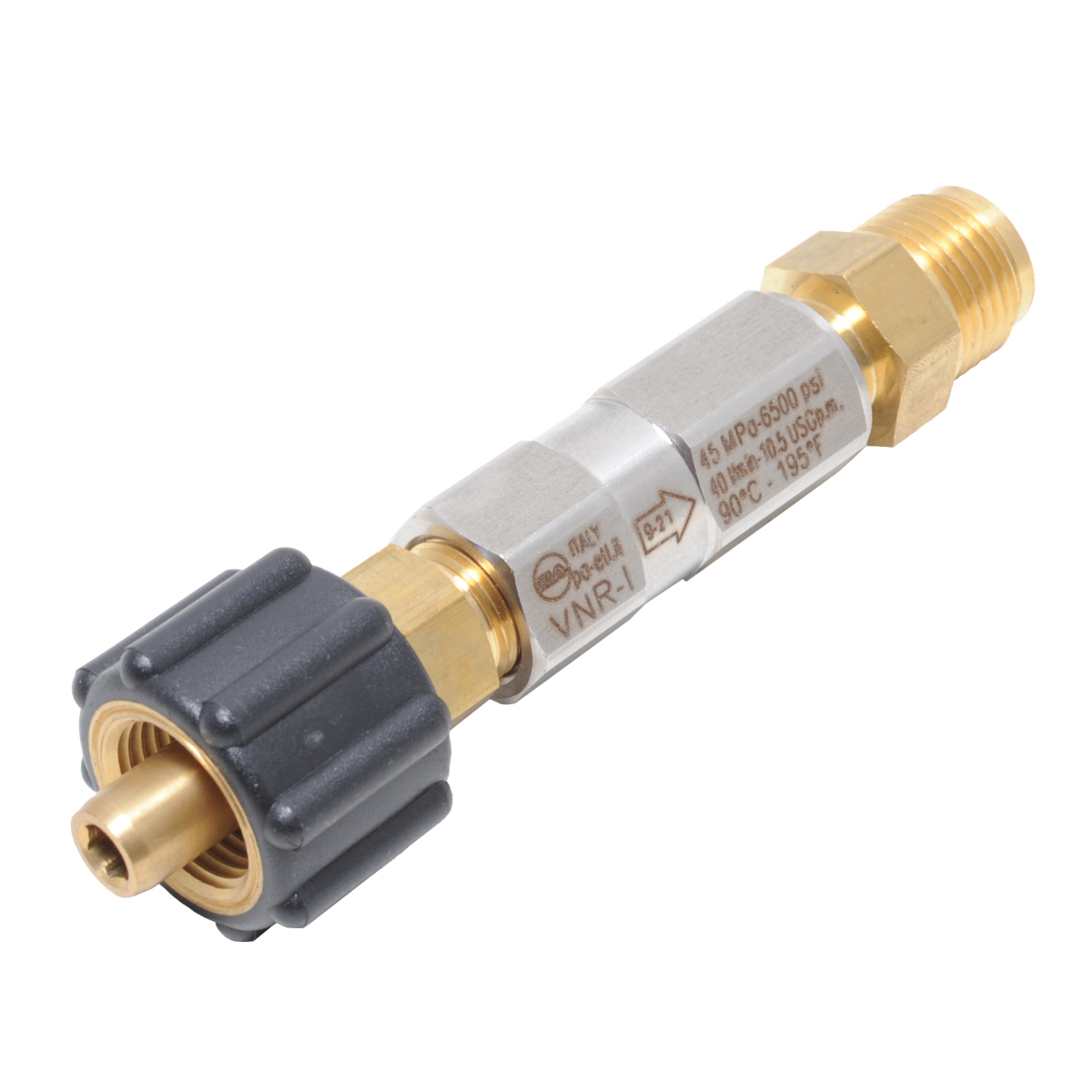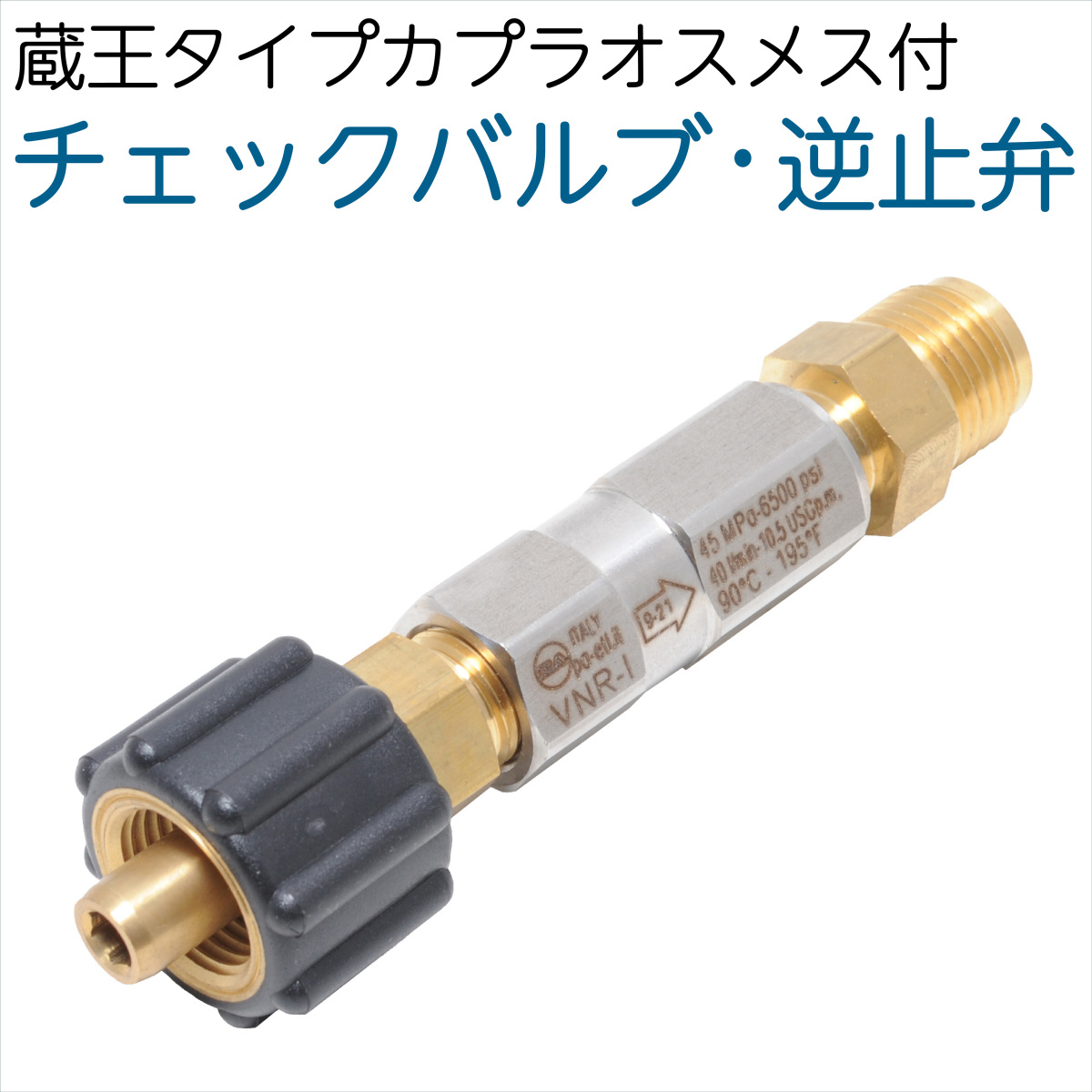 バックプレッシャーからポンプを守ります。ホースを長尺で使用する場合、特に上向にホースを伸ばして使用する場合、ポンプを守るために使用するチェックバルブ(逆止弁)です。ポンプも丈夫に作られており簡単には壊れませんが、ホースを40メートル以上で使用する場合は取り付けることを推奨しています。接続 蔵王タイプカプラー オス、メス最大耐圧 45MPa(450kgf/cm2)最大水量 40L/min耐熱温度 90℃