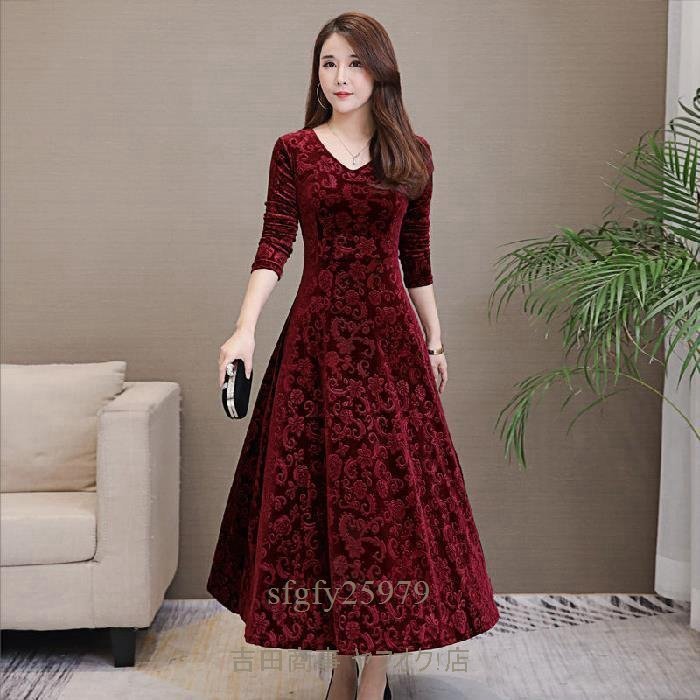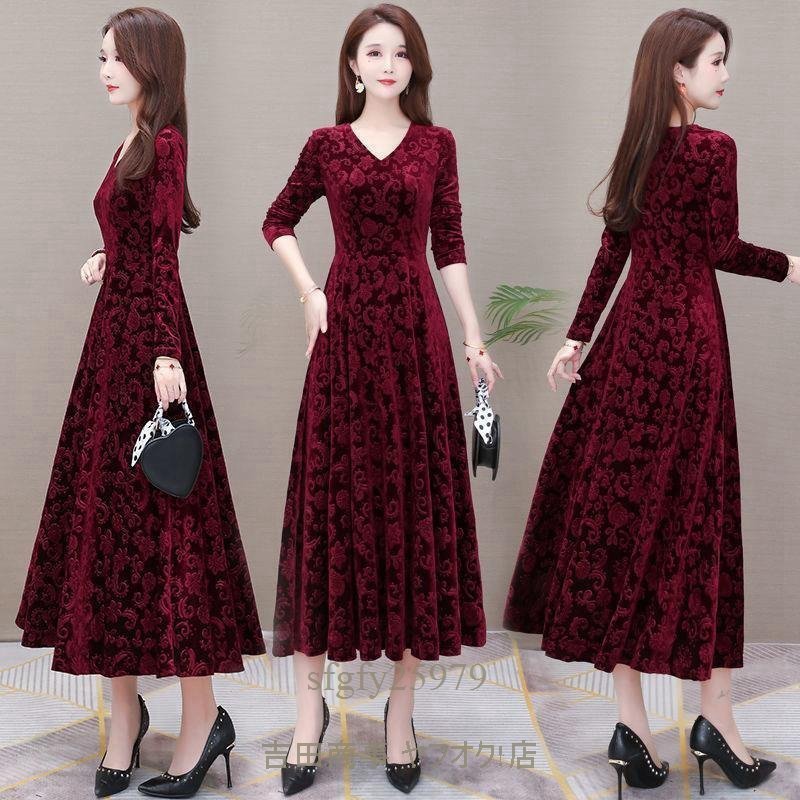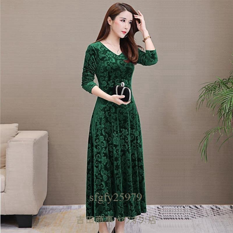 A9970新品ロングワンピース フレアワンピース パーティードレス 演奏会 発表会 ベロア ベルベット Aライン Vネック ドレス ブラック M