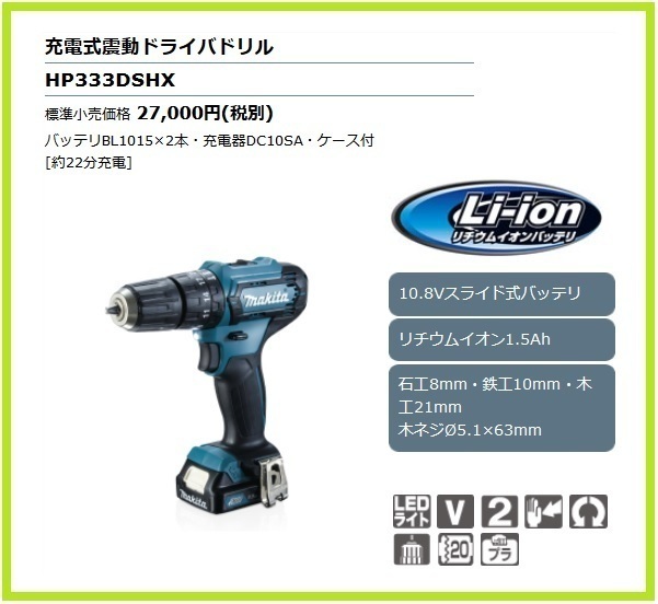1.1(バッテリ含む) | 13.0(震動ドリル) <2.5(ドリル) | プラスビット2-65 フック バッテリ(BL1015)×2本 充電器(DC10SA) ケース | ||