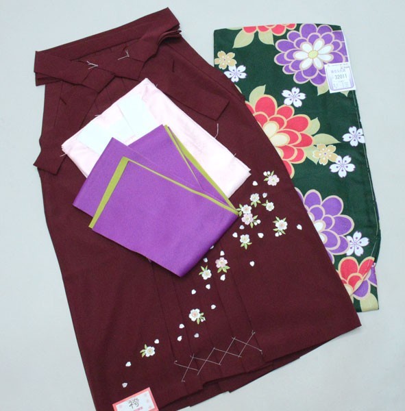項目 | 着物袴フルセット(適合身長:135cm~143cm:ジュニア用へお仕立て直し致します。) ・二尺袖着物 ・二尺袖長襦袢(半襟付き) ・重ね衿(着物に縫いつけられています) ・袴 ・袴下帯(浴衣帯にも使用できます。) |