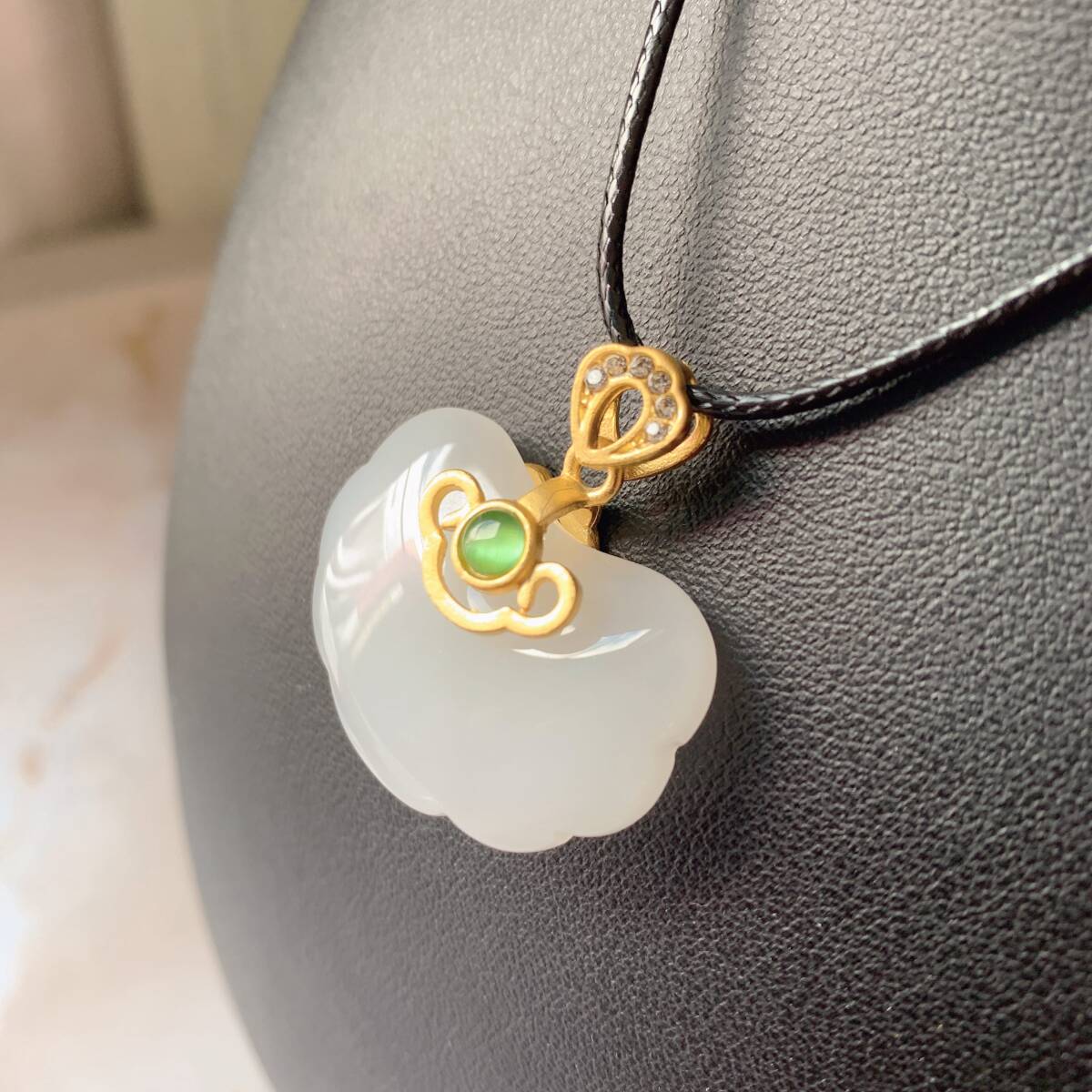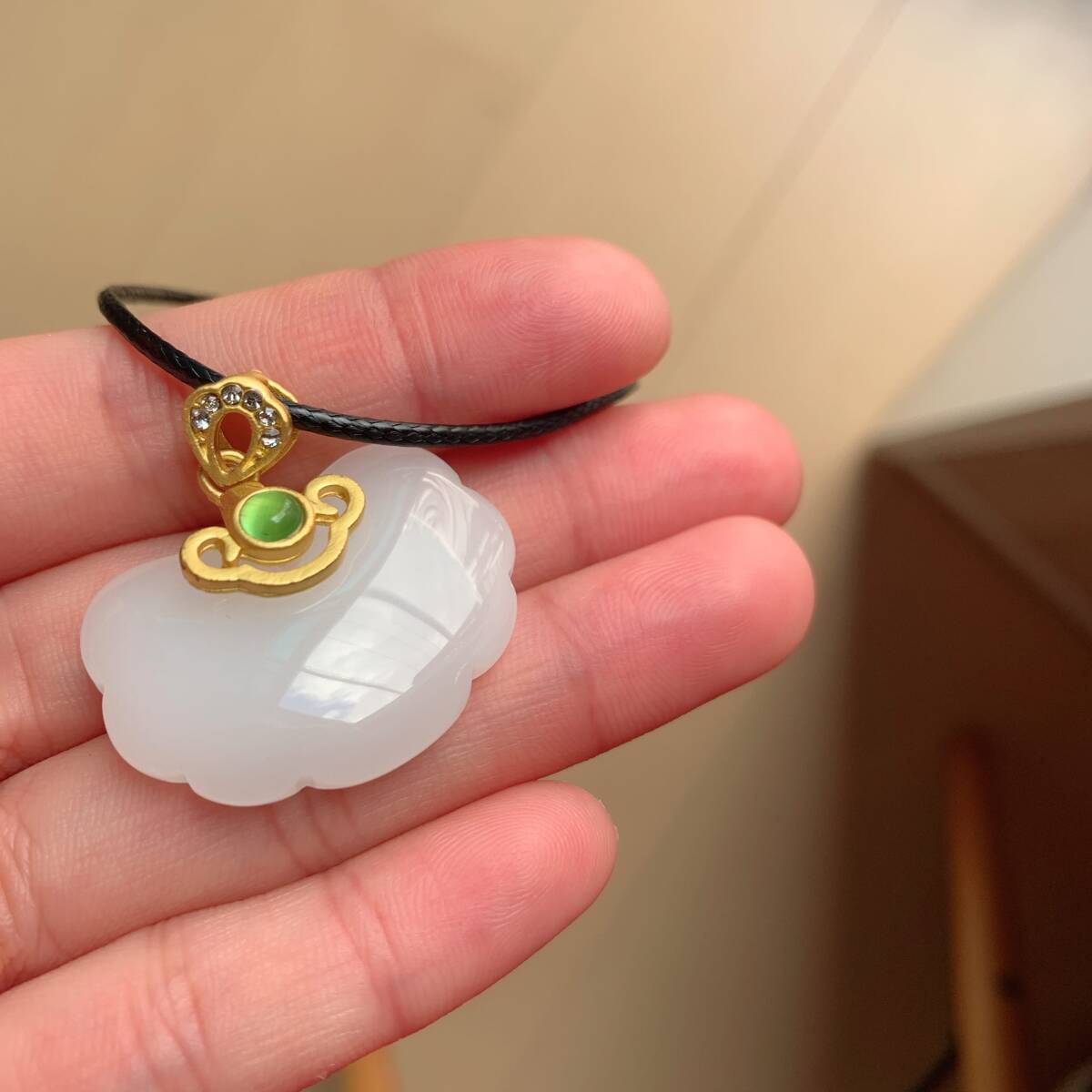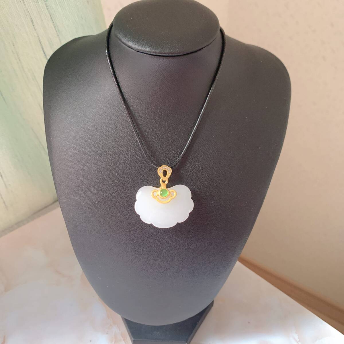 訳あり☆金糸玉・白玉☆天然石☆ネックレスペンダント☆如意錠形☆彫刻☆翡翠・ヒスイ☆ラッピング袋付き☆プレゼントにも 15PR30111