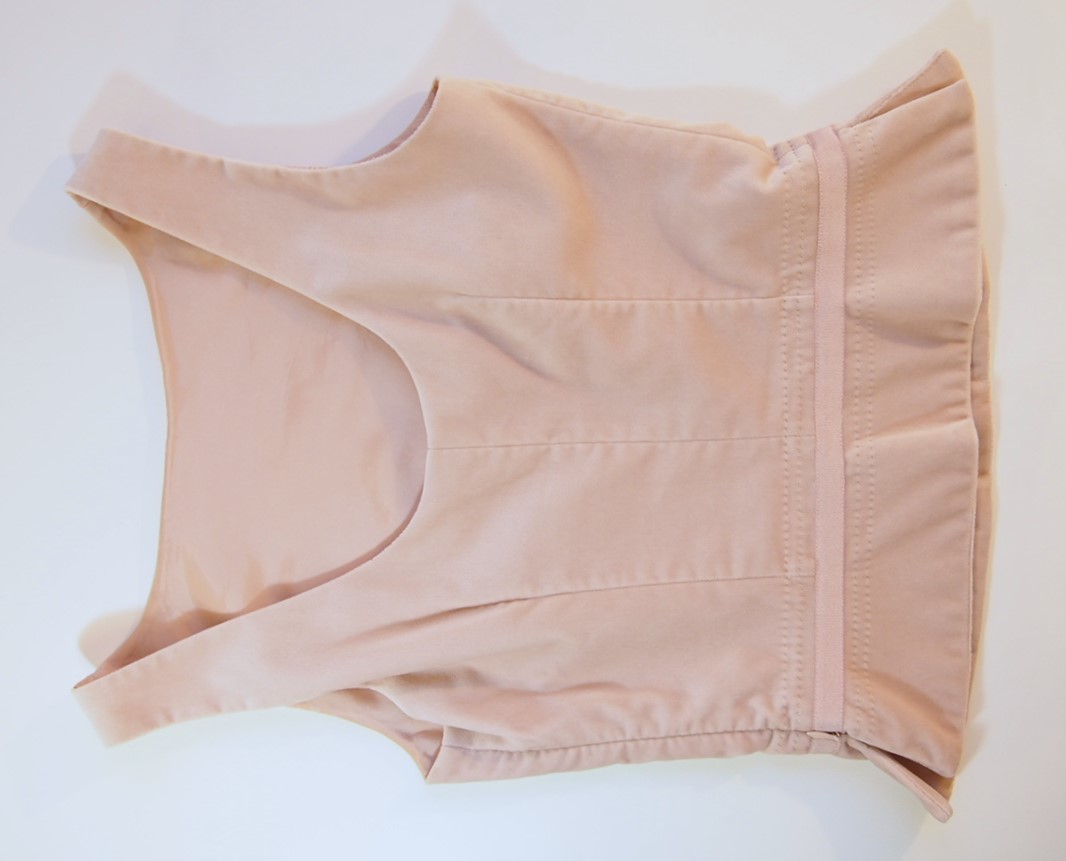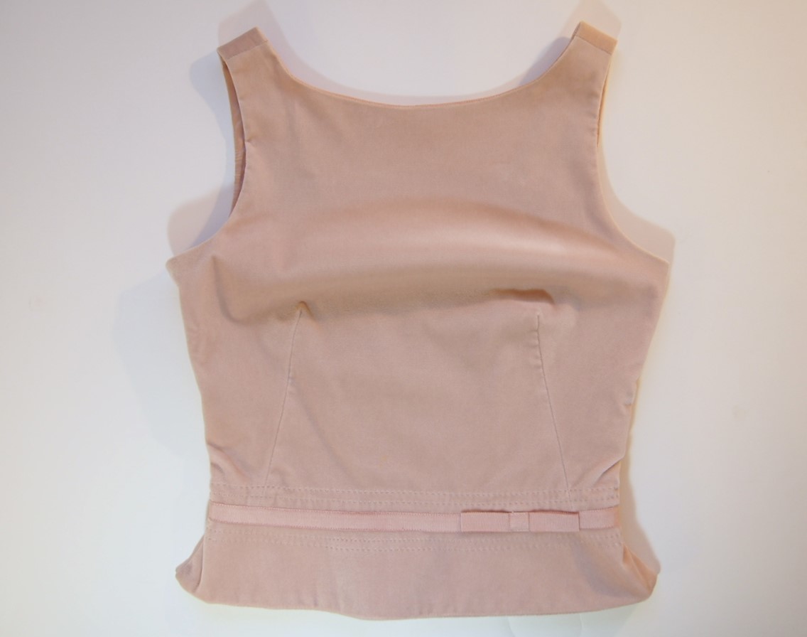 トップスはノースリーブで肩が少し入ったラインで、ウエストにリボンがあり、トップスの裾は裏もベロアで二重になっています。背中の開きも女性らしく素敵です。一般的な下着で背中から出る心配はありません。ほどよい開きです。