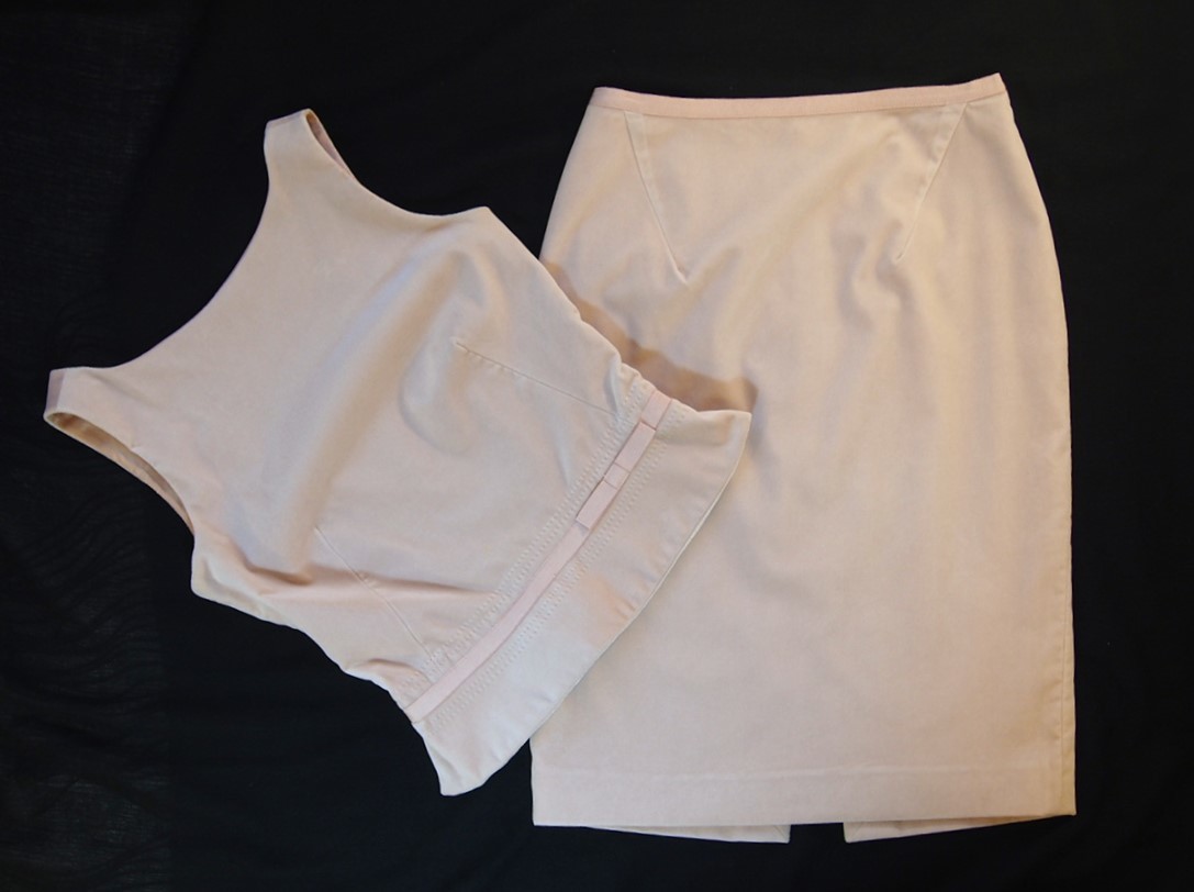コンパクトなトップスと、タイトスカートとのセットですので、セットで着ていただけ得れば、ビクトリアベッカムばりのIラインのワインピースのような辛口テイストにもコーディトしていただけるデザインです。