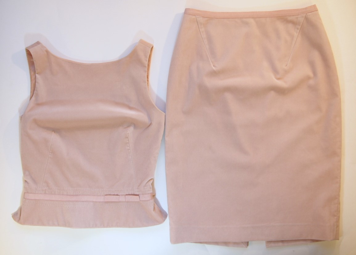 裏地付き。トップスは表示サイズ36で、S~Mサイズ相当、スカートは表示サイズ38で9~11号サイズ相当です。実寸サイズは、トップス =肩幅約32cm、(直線で左右を計測して。肩が中に入るデザインです)バスト幅約42.5cm(脇下を左右直線で計測して)、リボン部分の身幅約34.5cm。スカート=ウエスト幅約34.5cm、ヒップ付近の身幅約47cm(最大部分bで)着丈約59cm。以上は素人採寸の大まかな数値ですのでご参考までにお願いいたします。トップスはタイト目に着るデザインです。綺麗なダーツが上下とも入った立体裁断で、着ると綺麗なシルエットが出ます。体の線を拾いすぎない生地感とデザインですのでスタイルが良くみえるかと思います。スカートはフランスのブランドのものですのでタイトスカートとしてはヒップやウエストに余裕がある方かと思います。
