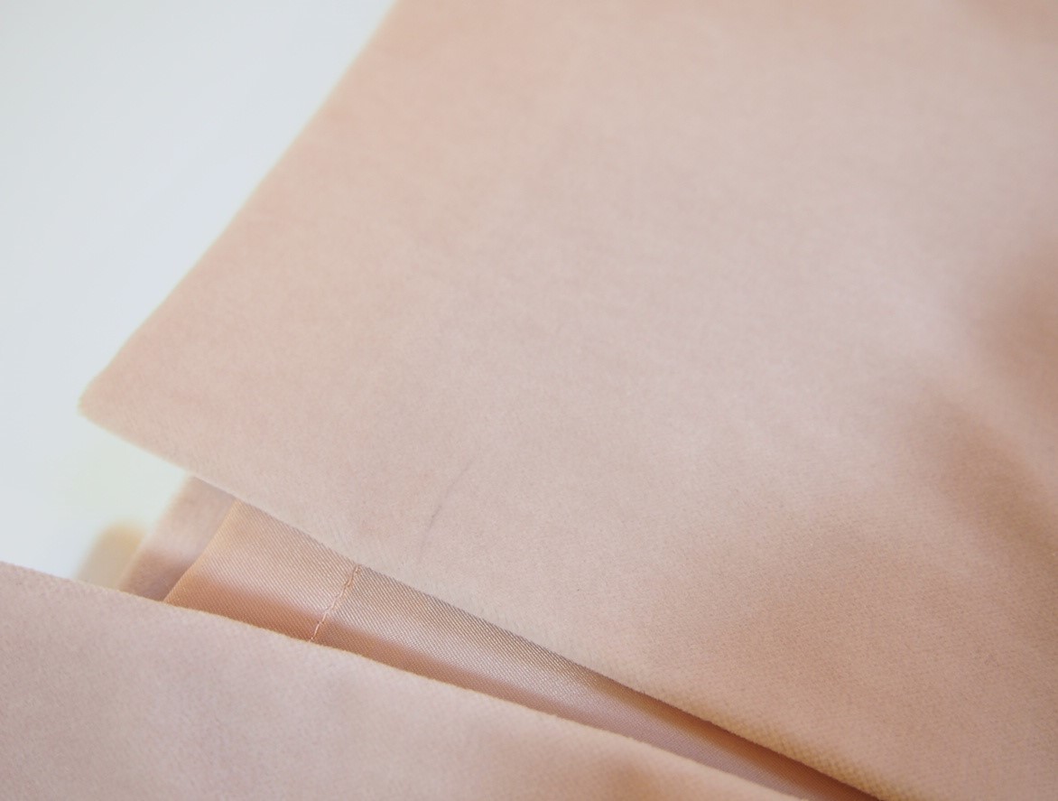 一目見れば違いのわかる、大変上質でソフトなベロア生地で、お色は大人の落ち着いたシックな薄ピンク。女性らしさ満点のお色です。