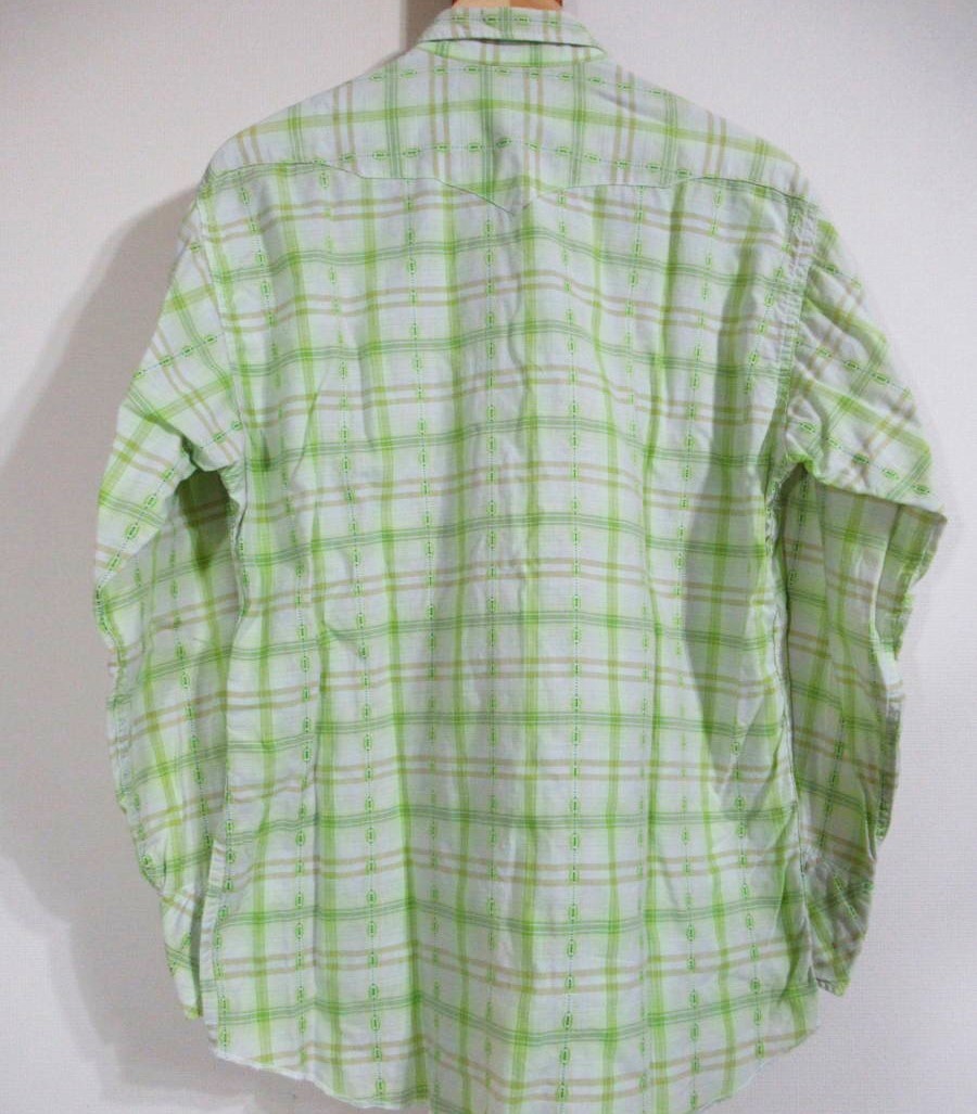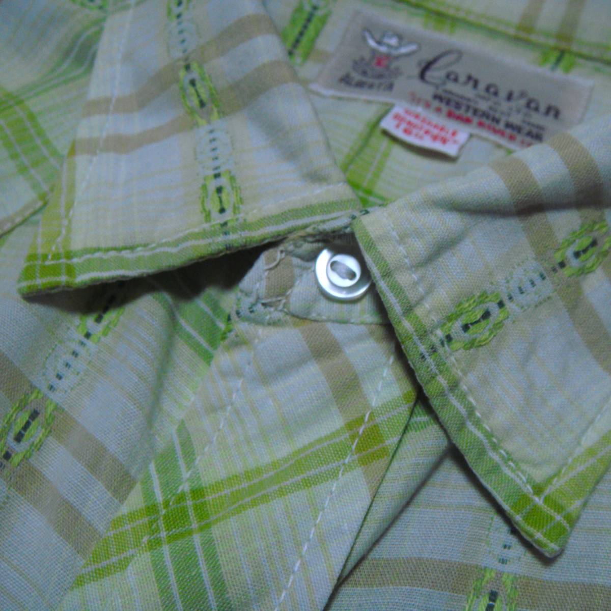【 見てくださり感謝いたします 】 【ブランド】 Caravan MFG.LTD. / キャラバン ■ ウエスタンシャツ ドビー織り(dobby) ビンテージ ショートポンとカラー 【 DAN RIVER 】 生地ブランドはDAN RIVER DAN RIVER社は、「ブルックス・ブラザーズ」に100年に渡って生地を独占的に提供 アメリカを代表する生地メーカー ウエスタンシャツですと H BAR C などに 2006年に倒産 アメリカの大統領御用達 イギリス王室御用達ブランドが姿を消したり、名前だけ残して潰れました が、こちらも本当にいいものを作り続けたがゆえに、つぶれた生地ブランドです ロデオスナップ スナップボタンは、RAU KLIKIT ビンテージものに多い、RAU KLIKIT 1912年に創業のRau Fasteners社製 1996年にスコービルが買収 こちらは、文字の大きなRAU KLIKIT で古いタイプ ■ サイズが合う方は、 是非!是非!!ゲットしてやって下さい (^-^)v 【表記サイズ】 USA 16 1/2 − M 日本サイズの Lぐらいです。 【実寸】 肩幅 48cm (左肩ステッチ〜右肩ステッチまで計測) 身幅 56cm (脇あたりで計測) 着丈 76cm (バック襟の付け根から計測) 袖丈 58cm (肩からの計測) 素人採寸です。多少の誤差はご了承下さい! 【素材】 表記なし 【状態】 USED 古いものとしは、良い状態です 襟 ・ 袖口に擦れはありません。(写真)。 【 見てくださり感謝いたします 】 ↓ クリックして下さい。 ■ ご覧いただければ幸いです。 ■ 他にも ウエスタンシャツを出品しています。 ■ リーバイス ■ カーハート ■ 取り置き 大歓迎!! N1 |