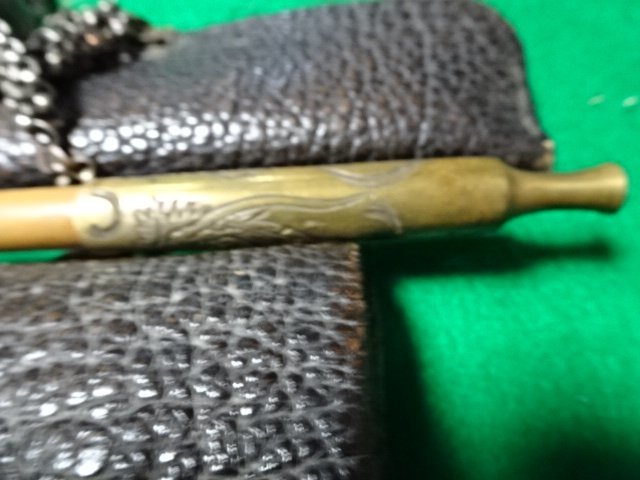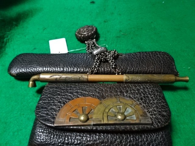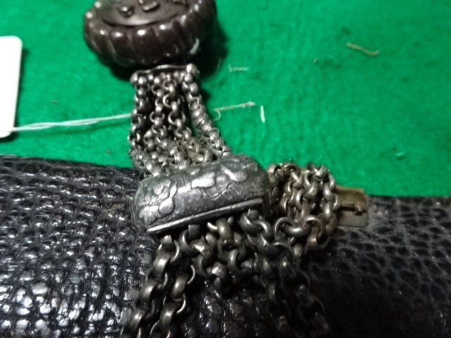 提げ物  銀の根付。 銀の鎖付きの煙草入れです。サイズはかますが16x10x4cm キセル入れが27x6x2.5cm です。キセルには筋彫があります。あまり出ないいいものです。