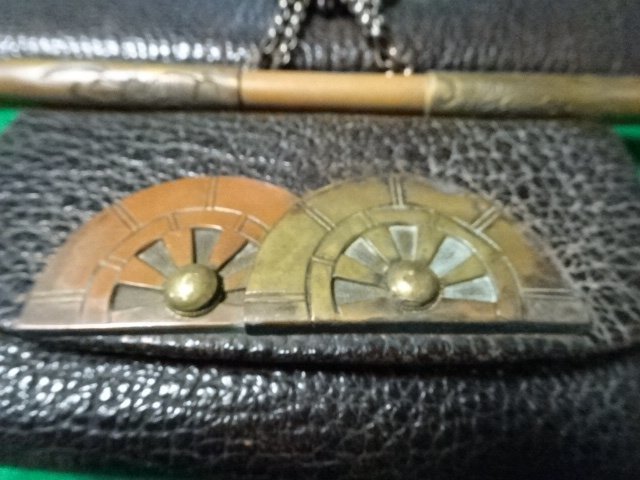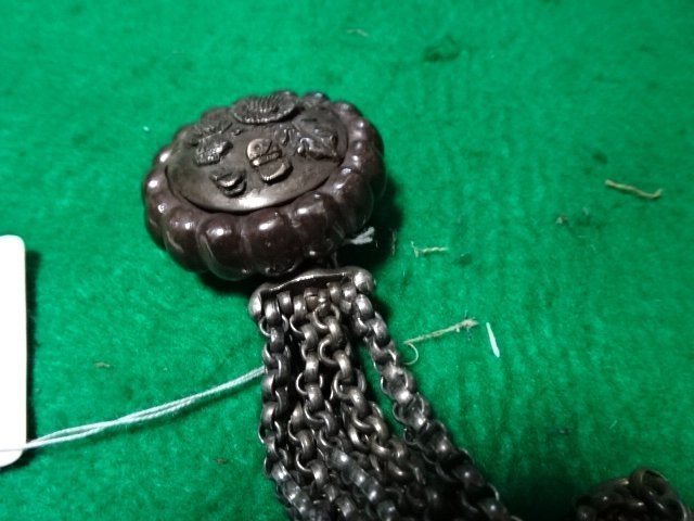 提げ物  銀の根付。銀の鎖付きの煙草入れ 前金具は 御所車
