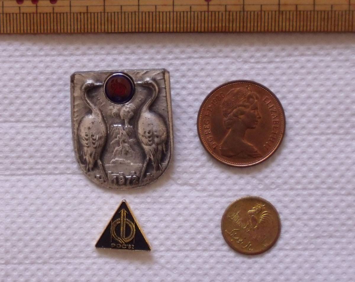☆第27回国民体育大会記念章、1980年英国2ペンス硬貨、POC微章、不明硬貨の4個で一式です。