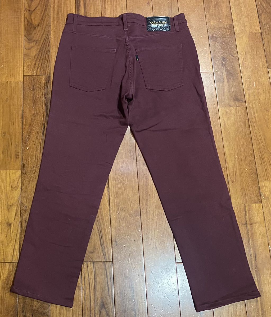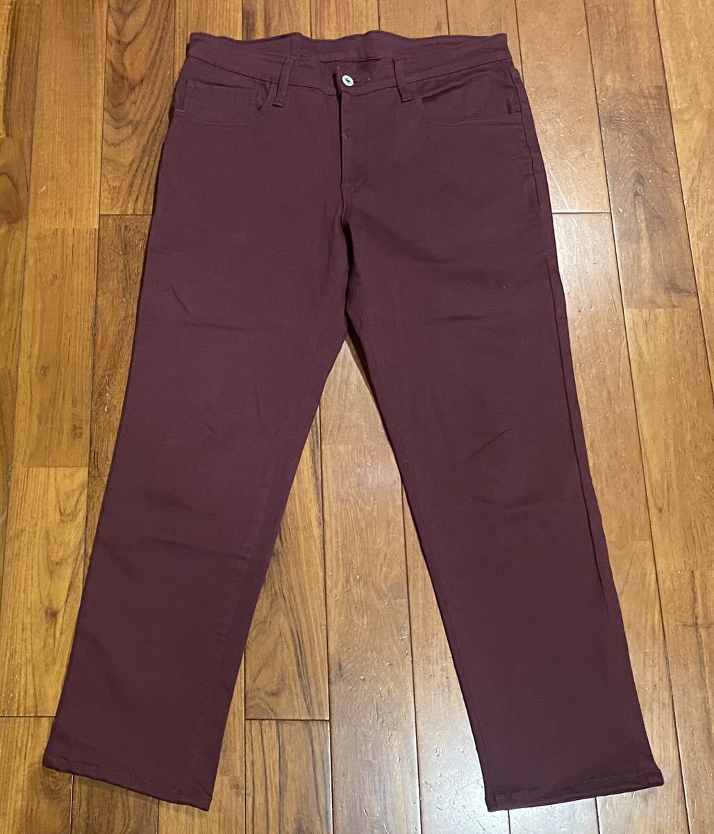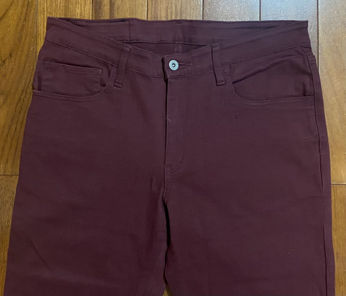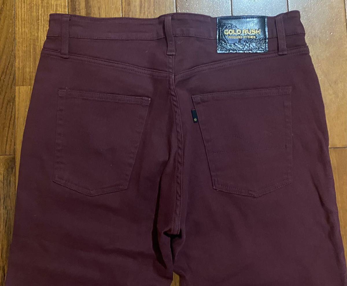 エドウィンのストレッチテーパードパンツ、GOLD RUSH KQ022です。色はワインレッドです。USEDでレングス短めですが状態は良いです(10段階中8程度)。生地はストレッチ入りで綿98%、ポリウレタン2%です。ジッパーフライです。正規品です((株)エドウイン、ベトナム製)。サイズはW32(ウエスト81cm)でウエストは重ねずに平置きで約86cm、ヒップ約106cm、股上約26cm、股下約68cm、股下15cmのふともも部分約51cm、裾まわり約36cm、重量約520gです。発送はゆうパケットポストになります。