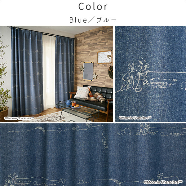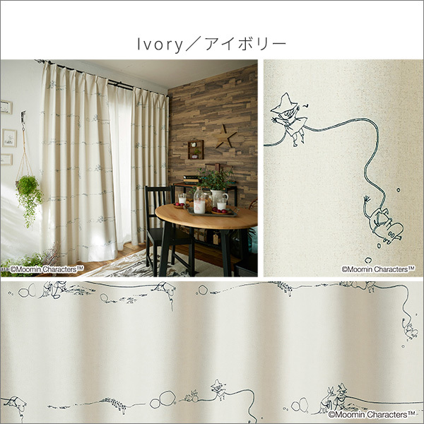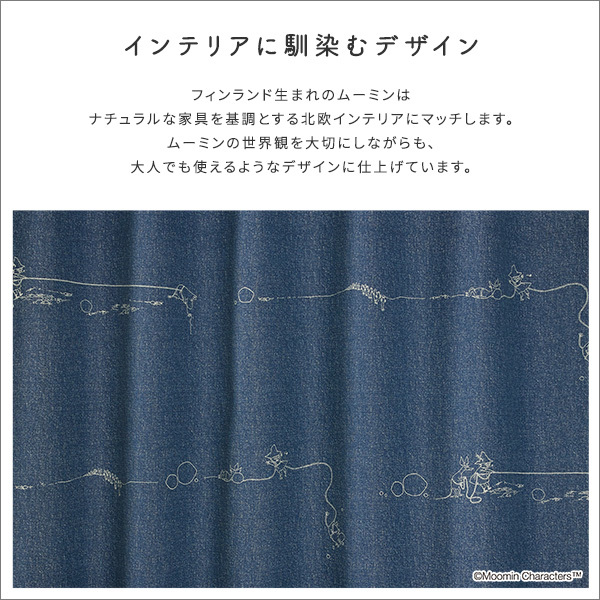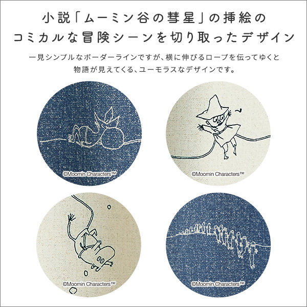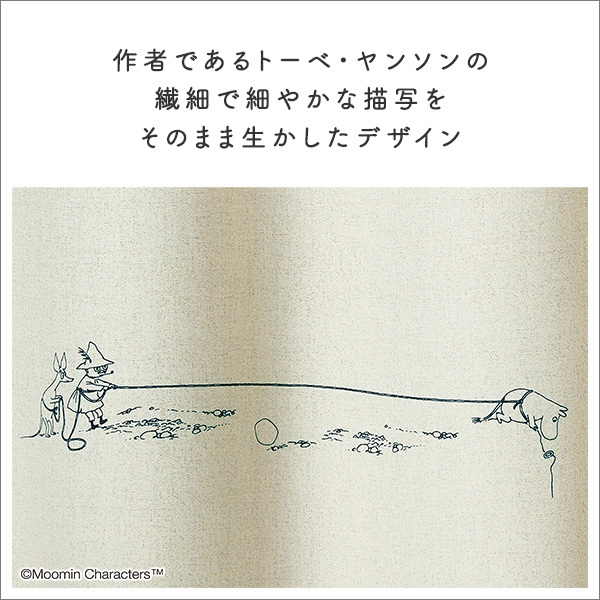 小説「ムーミン谷の彗星」の挿絵のコミカルな冒険シーンを切り取ったデザインのドレープカーテン