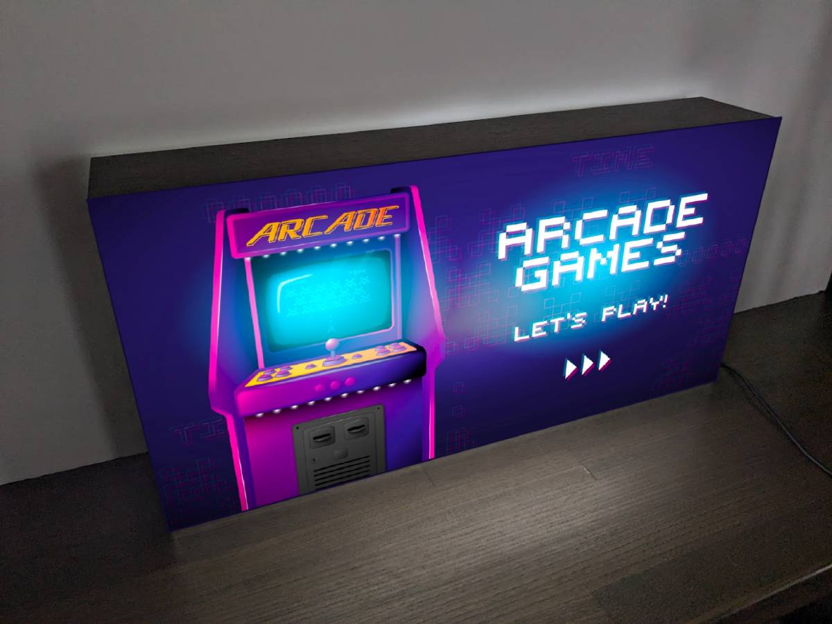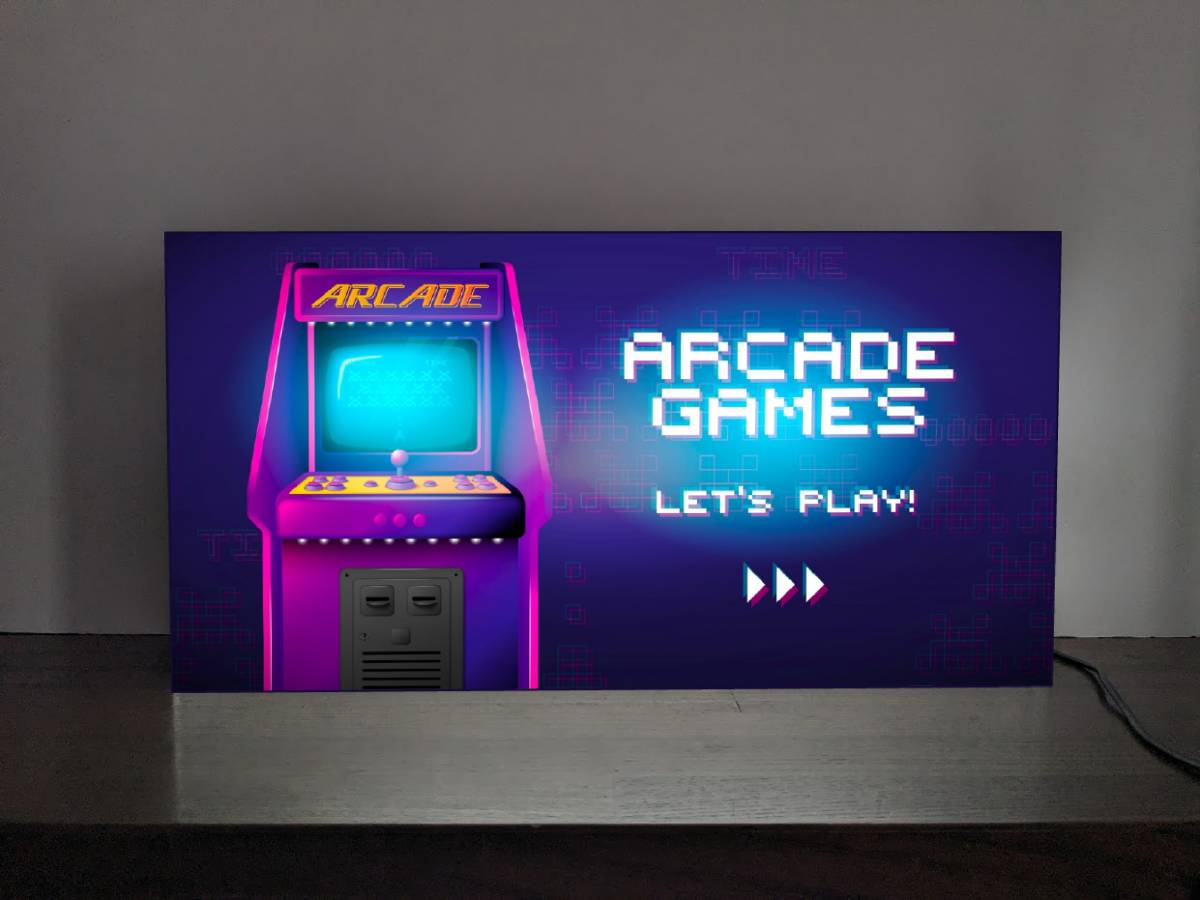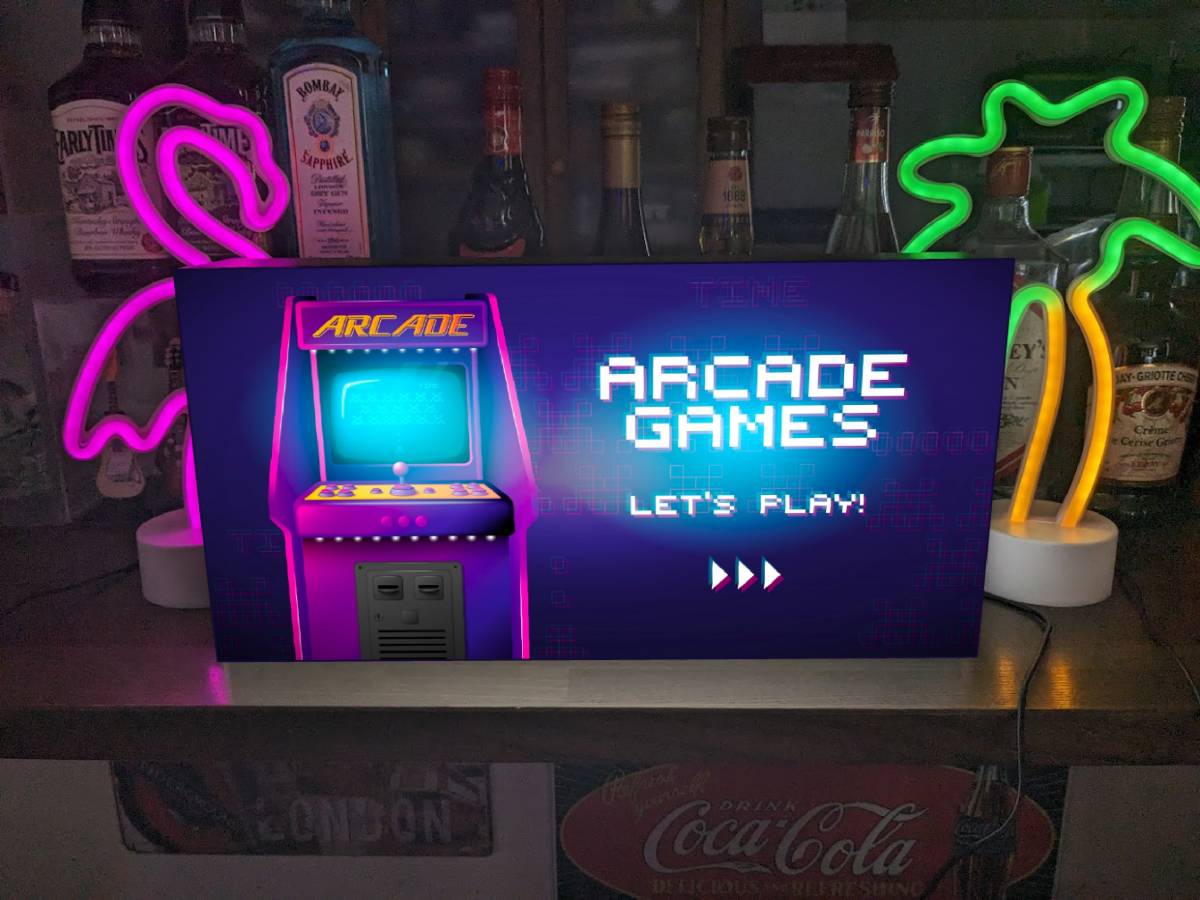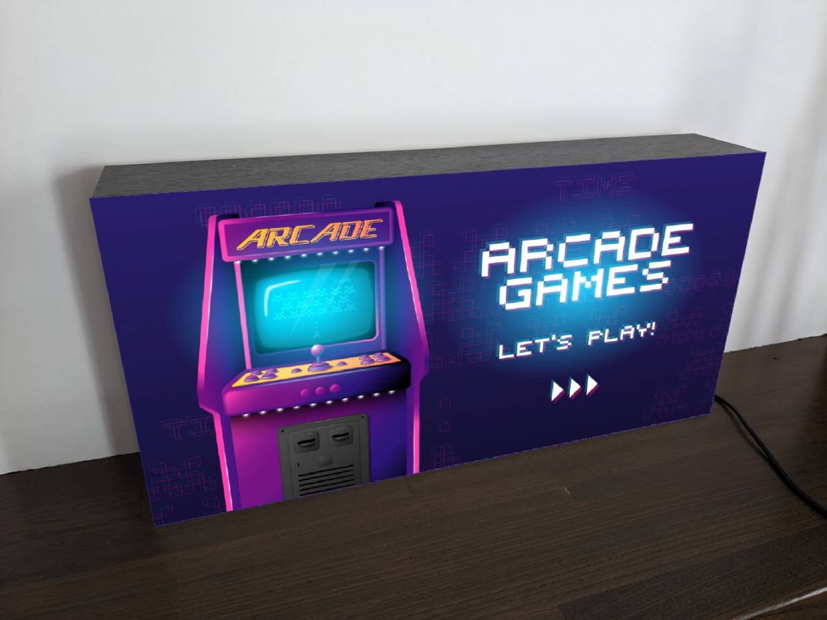 アーケードゲームファンのゲーマーの皆さんのご自宅・店舗・ガレージなどのちょっとした寂しいスペースをライトで明るく華やかに飾れる他には無い電飾看板です★ プレゼントにも大変好評頂いております★ ◆サイズ◆縦20センチ×横40センチ×奥行き7センチ ◆材質◆本体(アクリルプラスチック製)・表示面(IJバックライト発光フィルム貼り) ◆電源◆USB供給電源(家庭用コンセントコネクタ付き) 〇他サイズ〇 ●基本サイズ縦10センチ×横20センチ (3D造形BOX黒本体) ●Mサイズ 150mm×300mm ●LLサイズ 300mm×600mm ●3Lサイズ 400mm×800mm ◆オリジナルデザイン・オーダーも承っておりますので、お気軽にお問い合わせください。 自社製造製品 店舗 自宅 キッチンカー フードトラック 屋台 パーティー イベント サイン ランプ ライト 照明 看板 インテリア雑貨 置物 雑貨 テーブル カウンター 電飾看板 電光看板