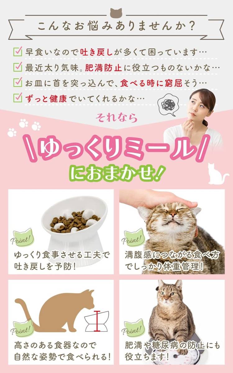 • 【猫ちゃんが押しても倒れにくい素材】ゆっくりミールはマット調の食器です。そのため、滑りにくくなっており、元気な猫ちゃんが押しても倒れにくい構造です。