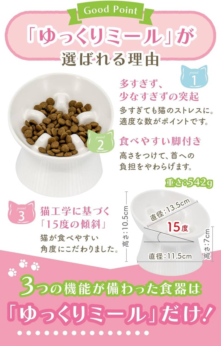 • 【食べやすい角度】ゆっくりミールは15度の角度がついていて、猫ちゃんがのぞき込まずにご飯を食べられるようになっています。猫ちゃんの首の負担を和らげるため、徹底的に考えて作られた食器です。