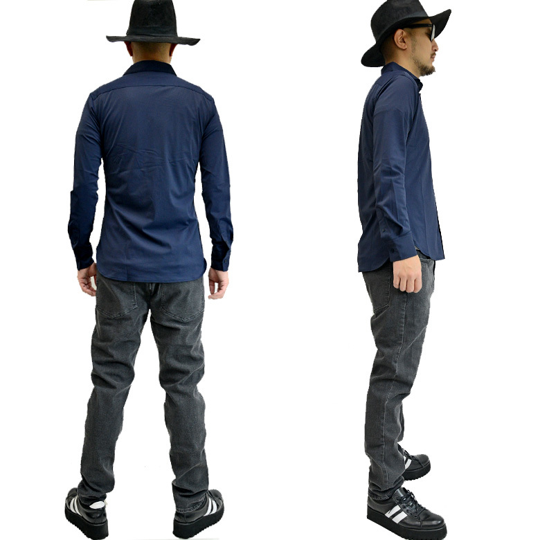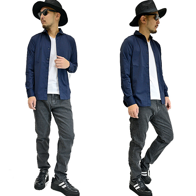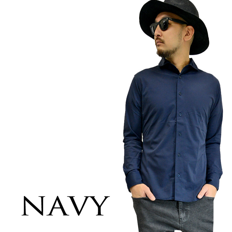 スーパーストレッチ長袖シャツ メンズ ラインストーン ロゴ ホリゾンタルカラー 0163n133 新品 ネイビー XL