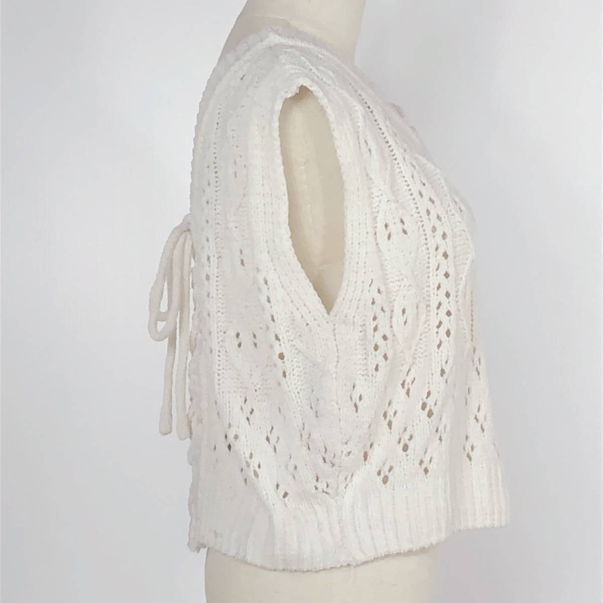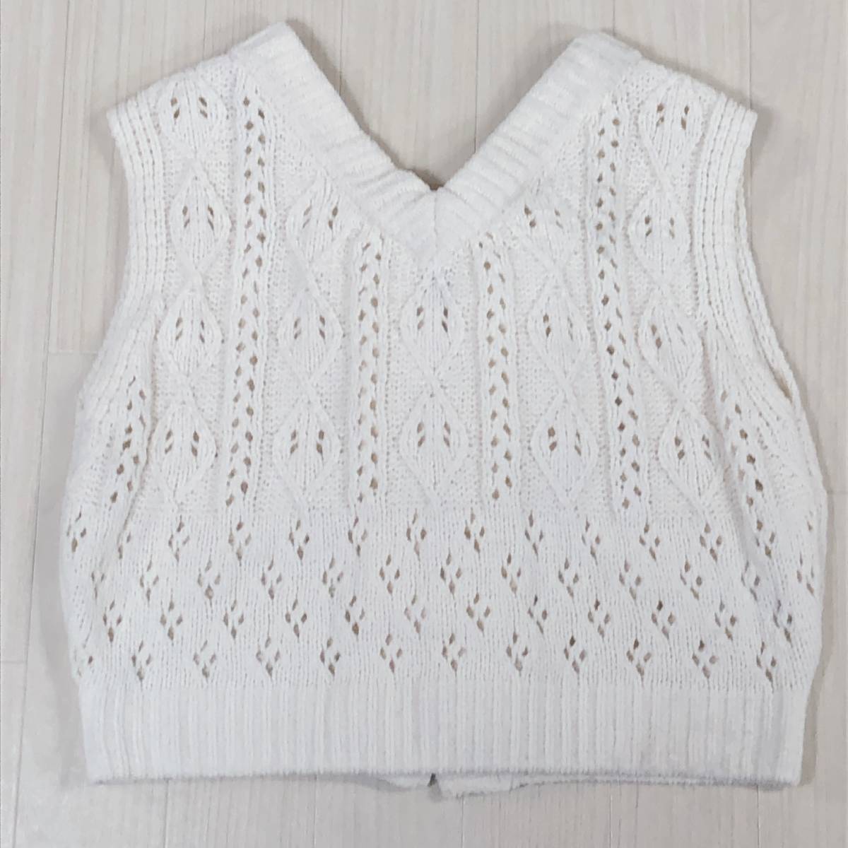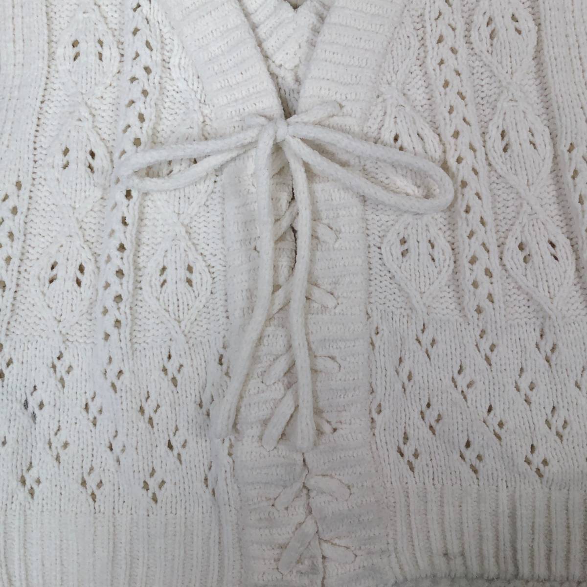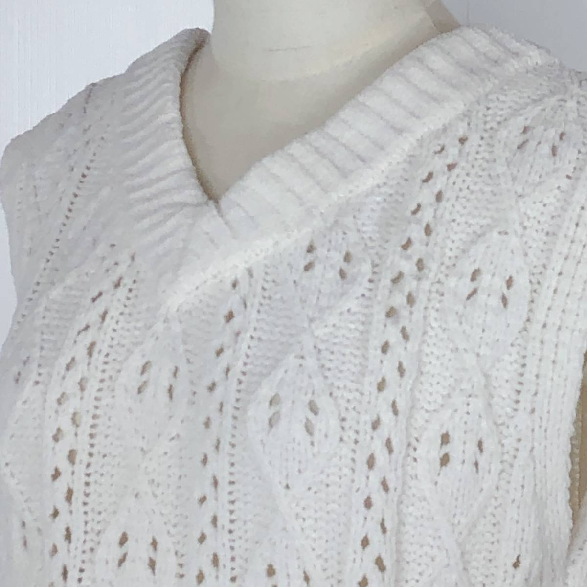 Y0438 美品 KHALITA ハリータ しまむら レディース トップス ベスト ジレ 袖袖 ニット ショート丈 編み上げ Mサイズ ホワイト 白 あったか