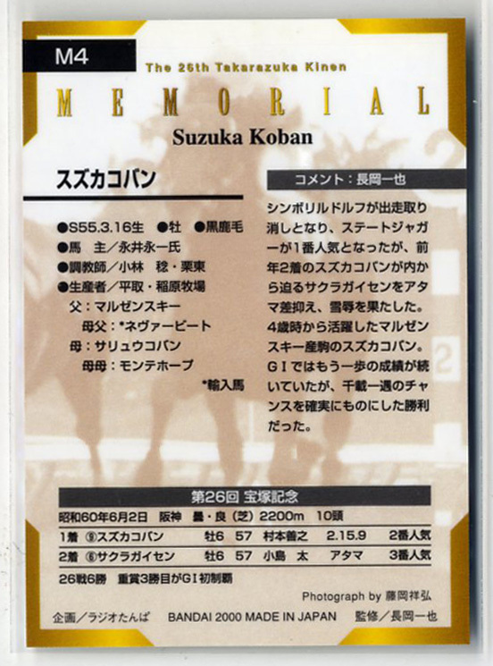 | ★スズカコバン M4 メモリアルカード 銀文字箔押し バンダイ サラブレッドカード 99年下半期版 村本善之 宝塚記念 写真 画像 競馬カード 即決 | |