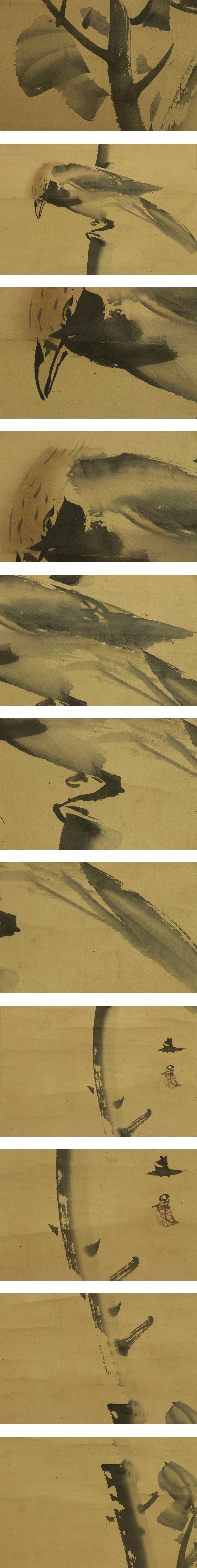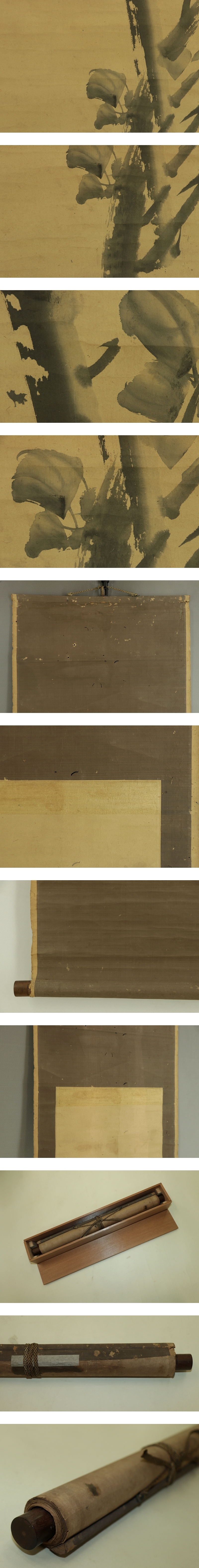 谷文晁 たに-ぶんちょう(1763-1841) 江戸時代後期の画家。 宝暦13年9月9日生まれ。谷麓谷の長男。加藤文麗,渡辺玄対らに師事。 狩野派,土佐派,南宗画,北宗画,西洋画などの手法を取り入れて独自の画風を創出, 江戸文人画壇の重鎮となる。田安徳川家に仕え,松平定信編「集古十種」の挿絵も描く。 渡辺崋山ら門人多数。天保11年12月14日死去。78歳。江戸出身。 通称は文五郎。別号に写山楼,画学斎など。 本紙は、染み、汚れ、強い折れ、皺、虫食い、擦れ、ヤケがあります。 表装は、染み、汚れ、強い折れ、強い皺、虫食い、破れ、ほつれ、生地剥れ、修理痕があります。 【サイズ】 作品 横約28.5cm×縦約128cm 表装 横約38.5cm×縦約181cm |