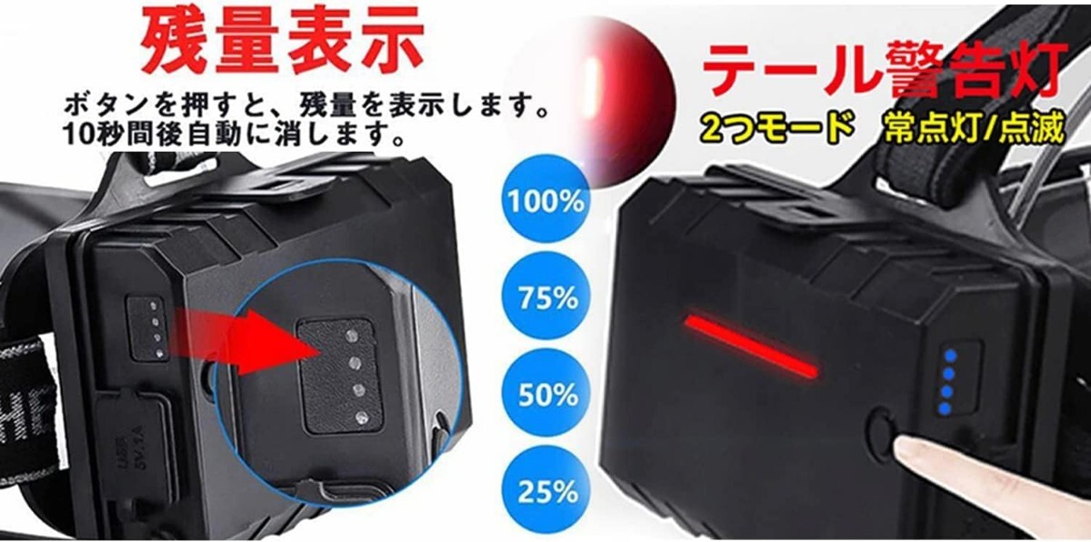 【Type-C急速充電+過充電保護+電力表示】超高輝度ヘッドライトには3つの大容量の充電可能な18650 バッテリーが付属しており、充電式ヘッドランプはType-C充電ケーブルで充電可能です、便利な充電。過充電保護ICが内蔵されています。 側面には4つの電源インジケータライトがあり、いつでもどこでも電力使用量を知ることができます。早めに充電するように通知します。また、長時間着用時に重さも気になる感じる場合は1本か2本のバッテリーを取り出して軽量化になり、明るさ変わらず!
