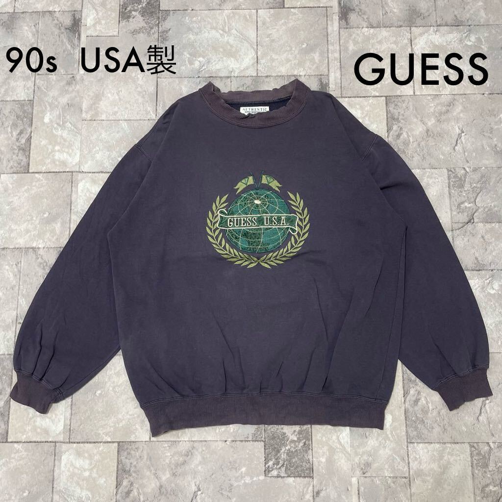 90s USA製 GUESS ゲス sweat スウェット 刺繍ロゴ ビッグロゴ トレーナー ヴィンテージ ナスコン ネイビー サイズXL 玉FL3494