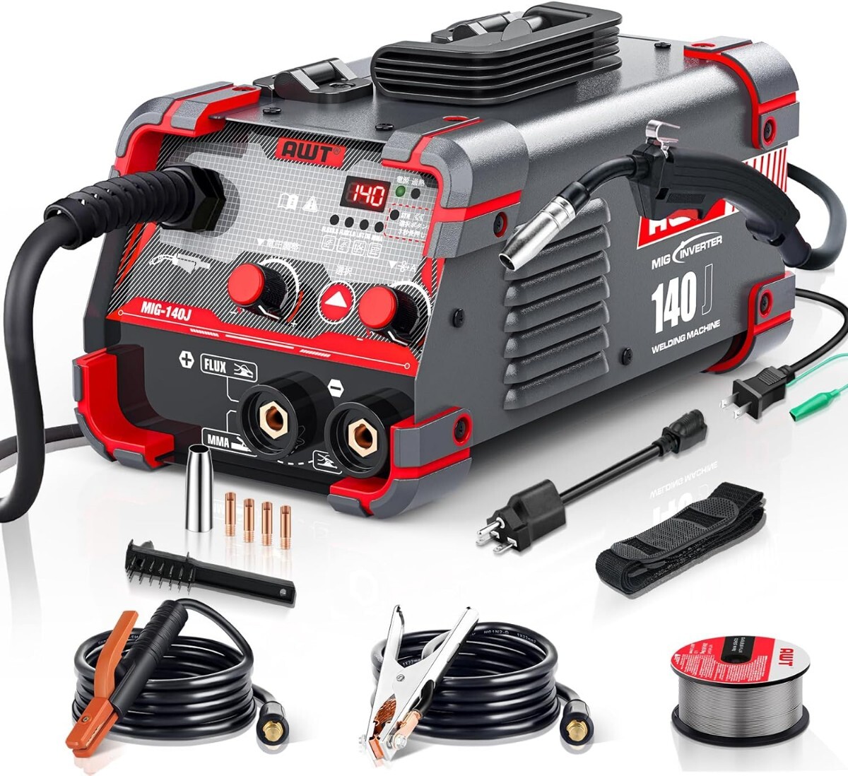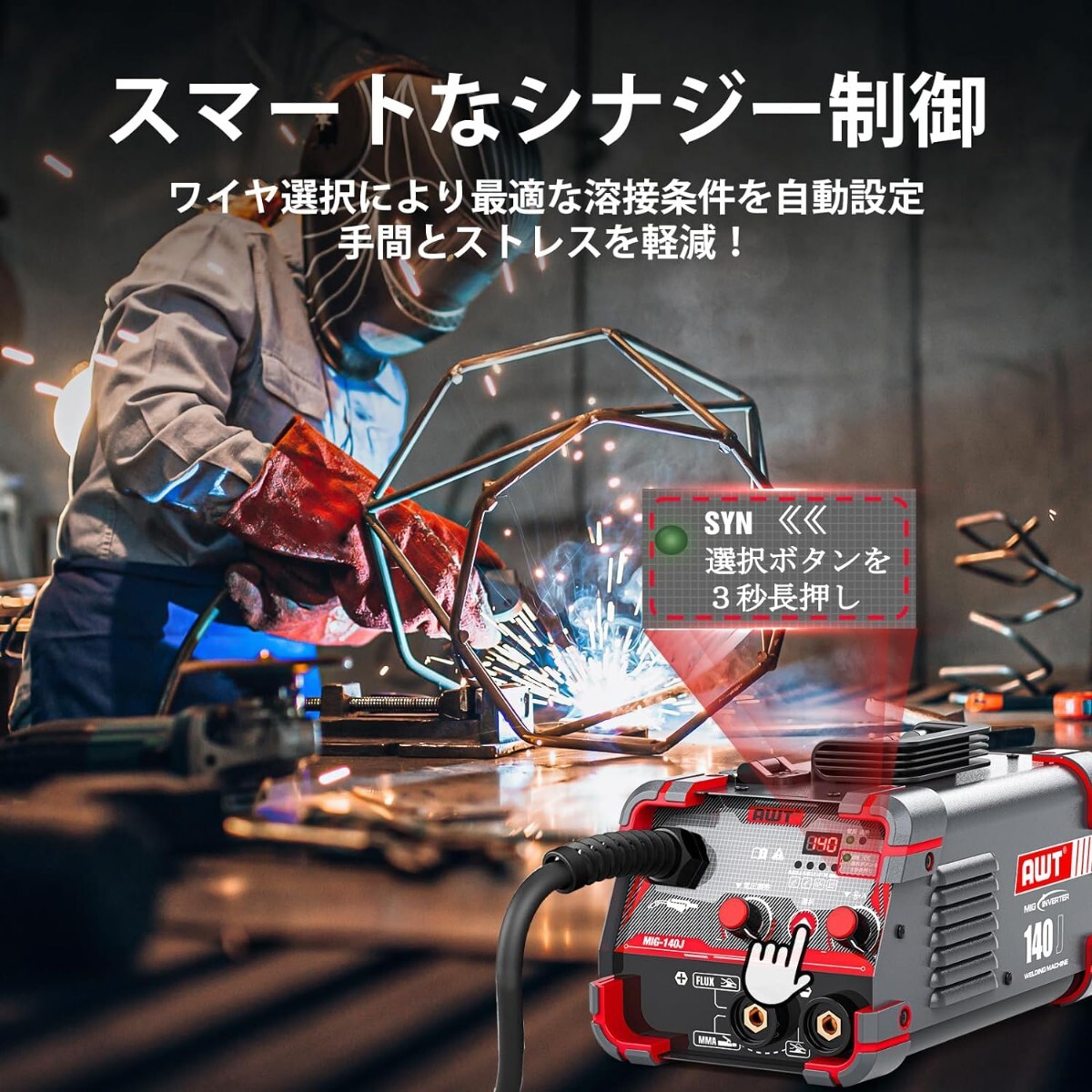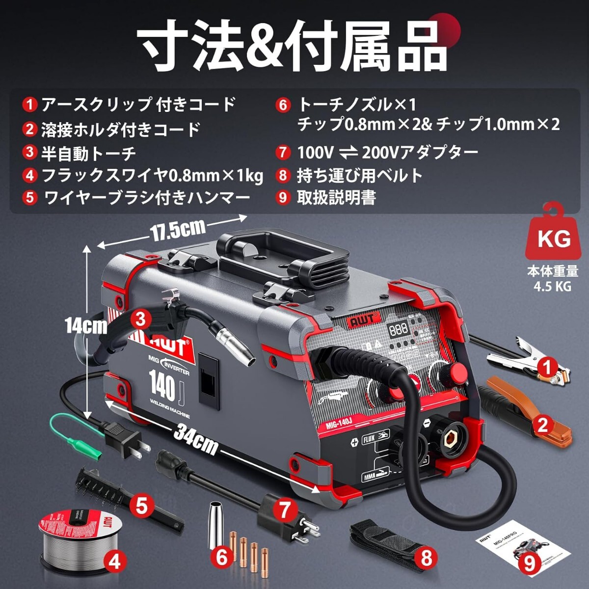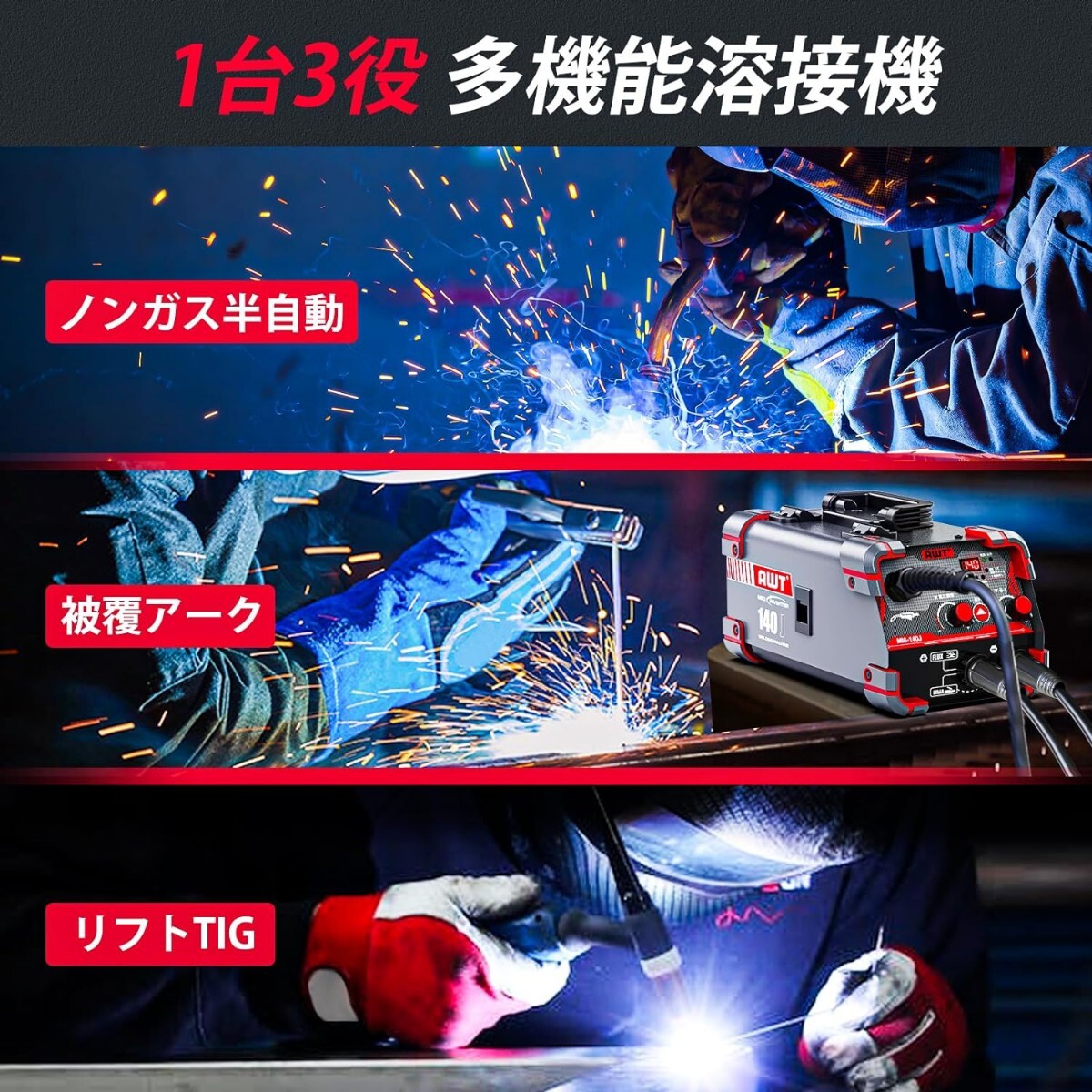 AWT 半自動溶接機140A 100V/200V兼用 ノンガス半自動/被覆アーク/リフトTIG溶接 1台3役 ノンガスミグ家庭用溶接機 小型軽量 【日本語取扱説明書付き】 インバーター直流溶接機