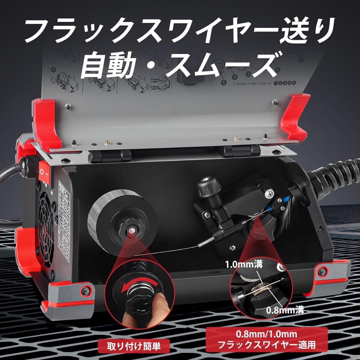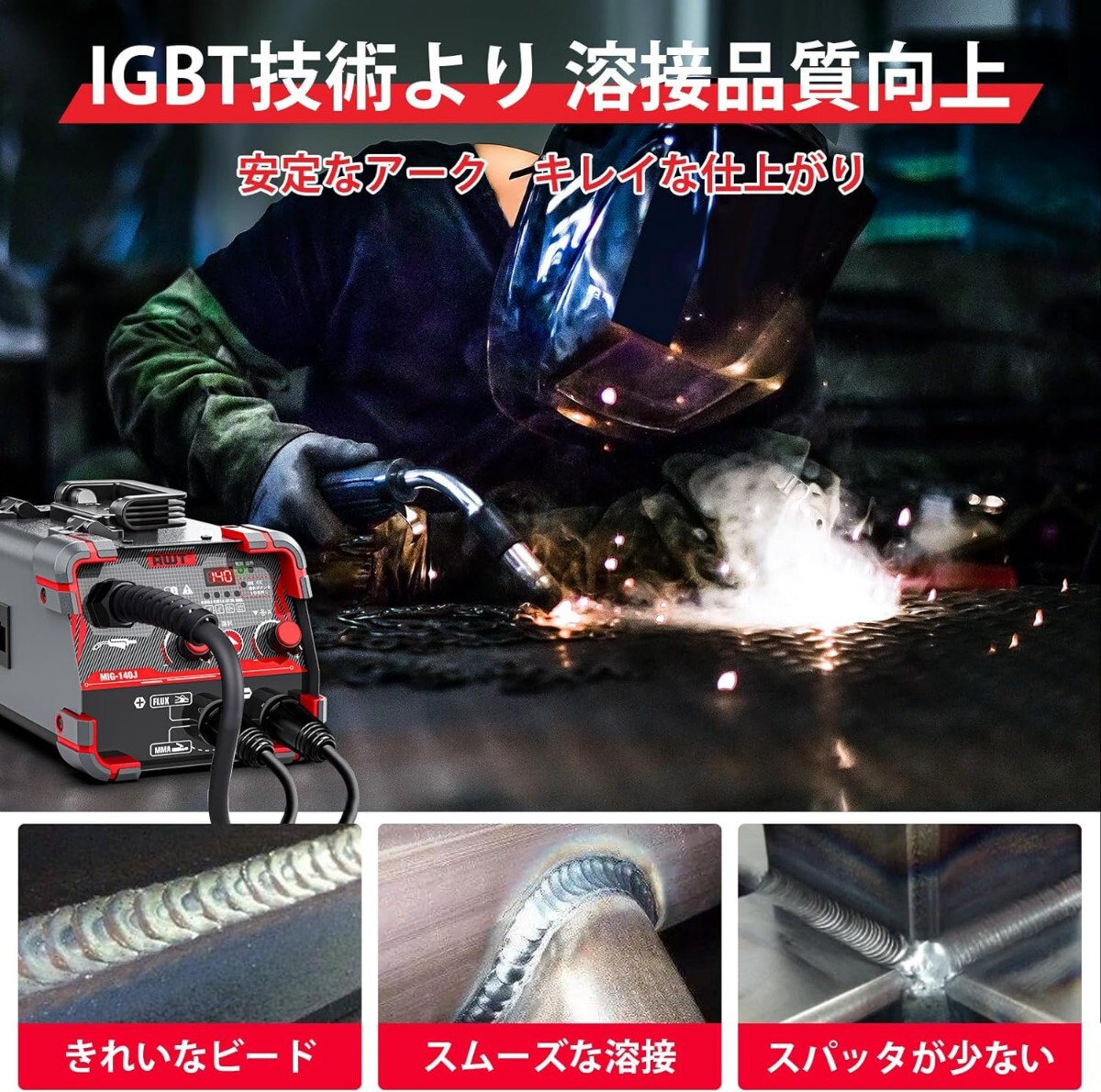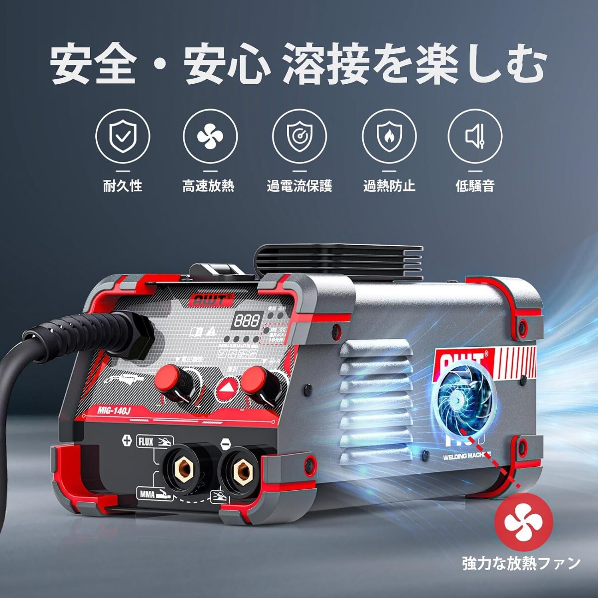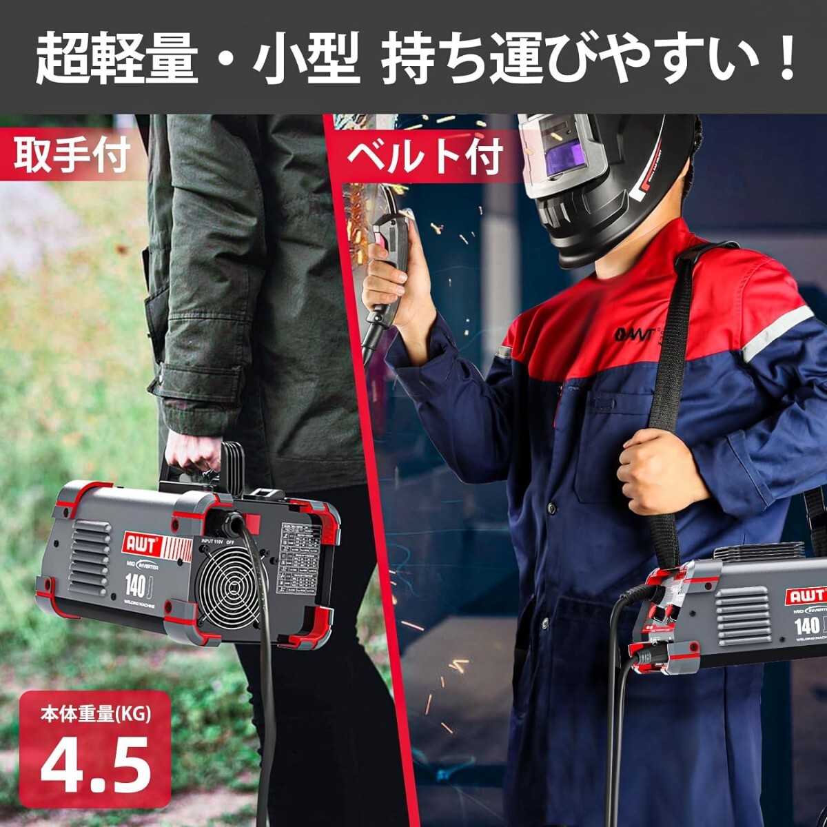 【小型軽量・幅広い用途】本溶接機は、僅か4.5kgの重量で、超コンパクト!取手や取り外し可能なショルダーベルトも付き、携帯性に優れ、家庭用溶接機としてDIYを自宅で楽しめます。電圧:AC100V/200V 周波数:50Hz/60Hz 定格出力電流:140A 適用フラックスワイヤー:φ0.8MM/φ1.0MM 溶接可能板厚:0.5-4.0mm