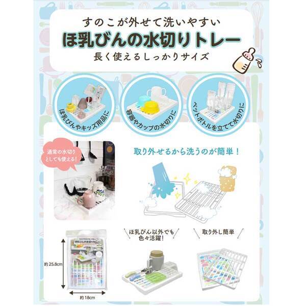 すのこを外して丸洗い! 洗いやすい水切りトレー。 ほ乳びん・マグ・コップ・ペットボトルなどを立てることができるしっかりサイズの水切りトレーです。 スタンドを閉じれば「すのこ」になるので、マグ・コップなどをそのまま置いて水切りができます。 ・スタンド付きの「すのこ」はトレー本体から外せるのでお手入れも楽ちんです。 ・「育児中はできるだけ長く使いたい」という方にオススメです。 ・短いスタンドと長いスタンドを立てることでほ乳びんやパーツ類、食器類、ペットボトルなどの水切りができます。 ・スタンドを閉じれば通常の水切りとしても使えるので用途に合わせてご使用いただけます。 ・スタンドを片方たたんで、半分「すのこ」、もう半分を「ほ乳びん立て」など使い方は色々。 ・トレーにはキッチンに合わせやすいカトラリー柄。 通常の印刷ではなく、絵柄フィルムを埋め込んで成型をしているので「絵柄が剥がれる、欠ける」などの心配はありません。 ・すのこが取り外しできるので、洗いやすく衛生的にご使用いただけます。 「大人の食器とは別にしたい」という方にもオススメです。 ※トレー以外(ほ乳瓶等)は商品に含まれておりません。 個装サイズ:210X300X25mm 個装重量:約270g 内容量:1個入 製造国:日本 【発売元:株式会社オールウェイズ】 【品質表示】 原料樹脂:ポリプロピレン 耐熱温度:80度 製品サイズ:260×185×20mm(スタンド折りたたみ時) 【使用方法】 ・スタンドを立ててください。 ※スタンドが止まる位置までしっかり立ててください。 ・スタンドに掛けるものによって長短のスタンドを使い分けて使用することができます。 ・ちょっとしたものを省スペースで手軽に水切りできます。 ・スノコは取り外して洗えるので楽ちんです。 【注意】 ・スタンドは折りたたみ式ですので、スタンドがきちんと立っている状態か確認してからご使用ください。 ・ご使用後はよく洗浄し水気を切ってから保管してください。 ・電子レンジ・食器洗い乾燥機にはご使用にならないでください。 ・お子様の手の届かない場所に保管してくだだい。 ・火のそばに置かないでください。 注意事項 予告なく成分・パッケージが変更になることがございます。 予めご了承ください。 *予告なく成分・パッケージが変更になることがございます。予めご了承ください *ダンボールを使用して発送する場合には、入数以下の個数の場合、 中古ダンボールを使用する場合があり、ご注文の商品とは異なるダンボールになる場合があります。 あらかじめ、ご了承ください。 |