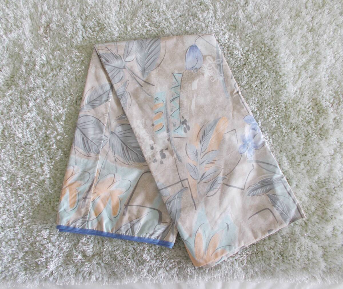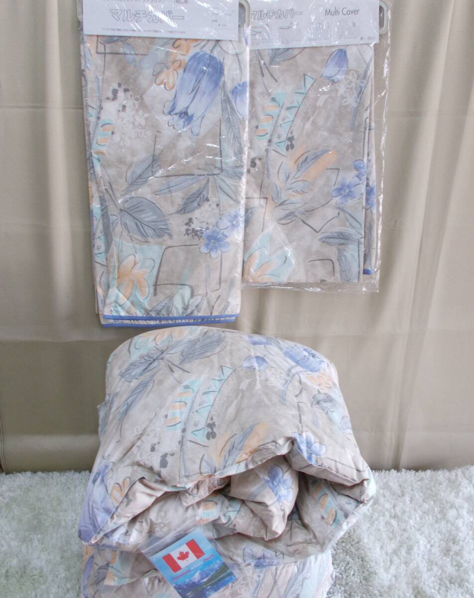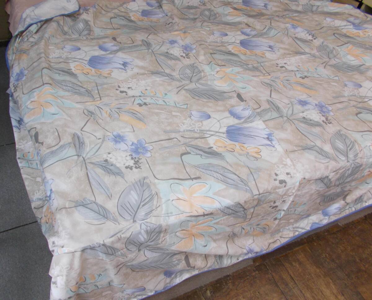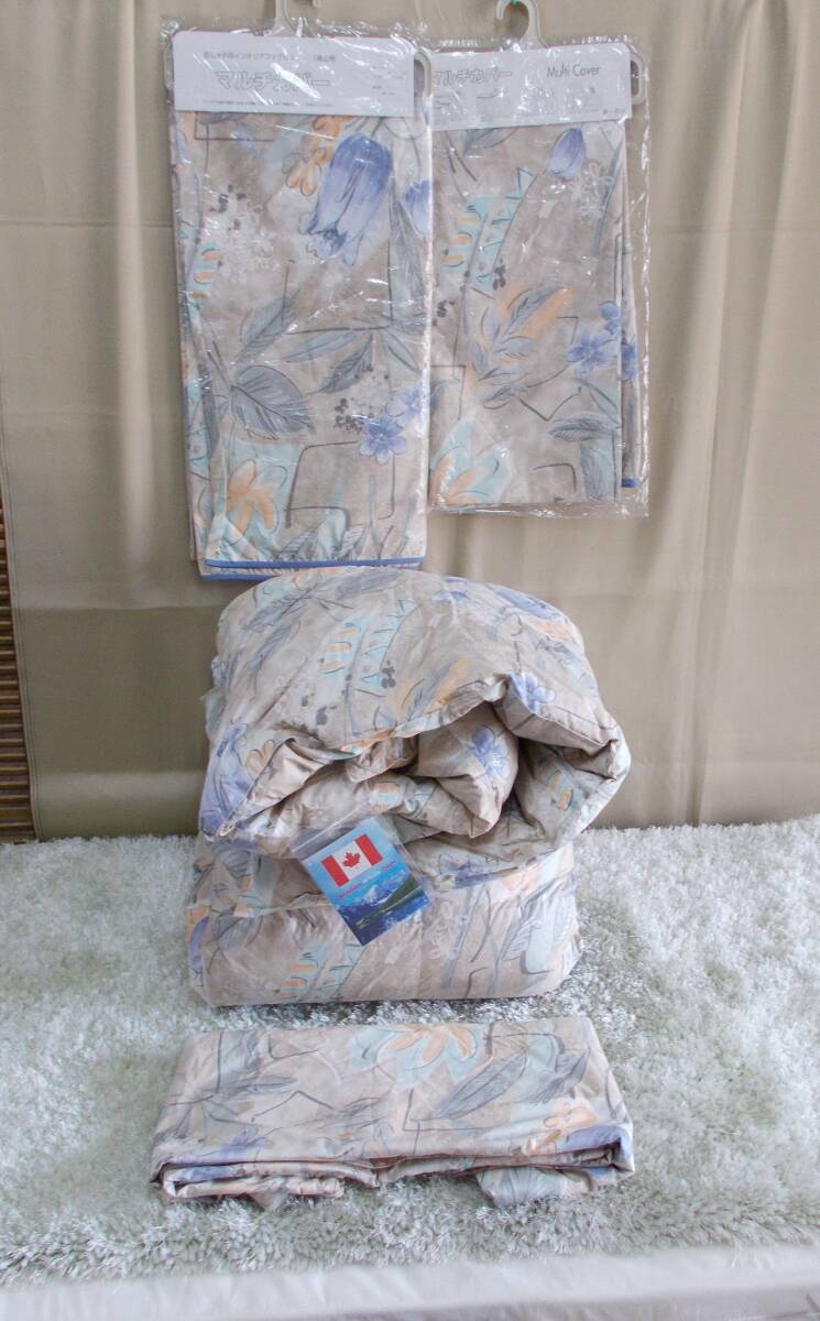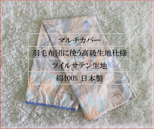 廃業した羽毛布団メーカーより、高級羽毛布団用の生地を市場価格の半値以下で買い取り、大量に生地を買ったため、他の工場で羽毛布団を製造しましたが、使いきれずに布団カバーとマルチカバーを作りました。マルチカバーなどのカバー類はほとんどが格安のポリエステル混生地で作りますが、高級な生地がたまたま残ったので制作したマルチカバーです。