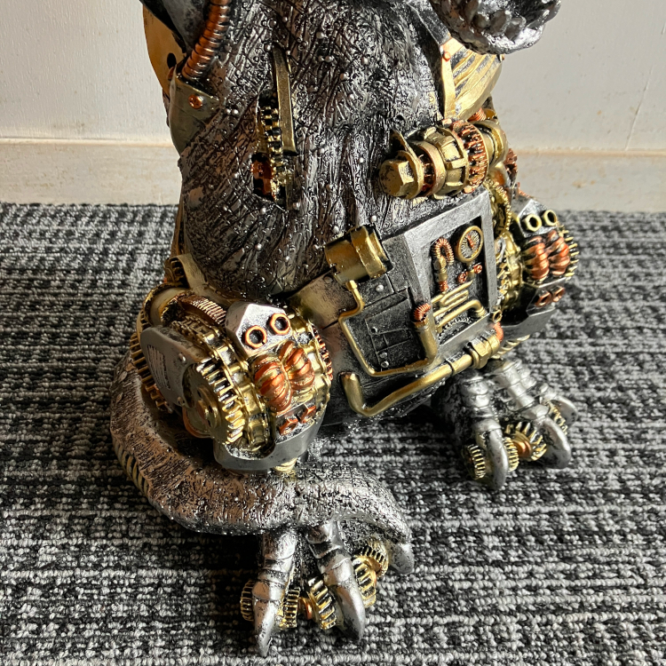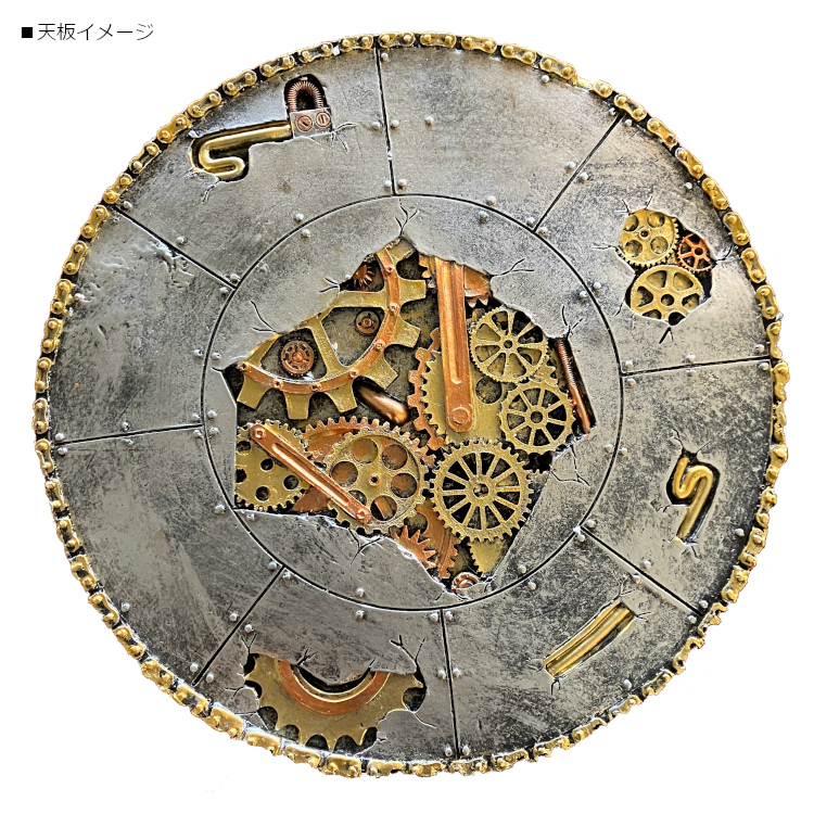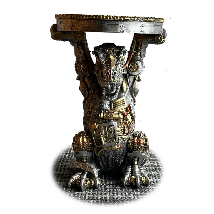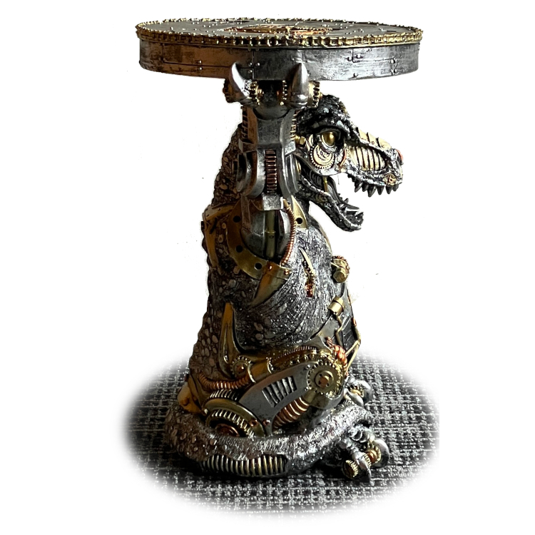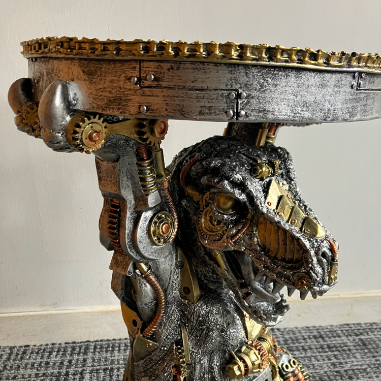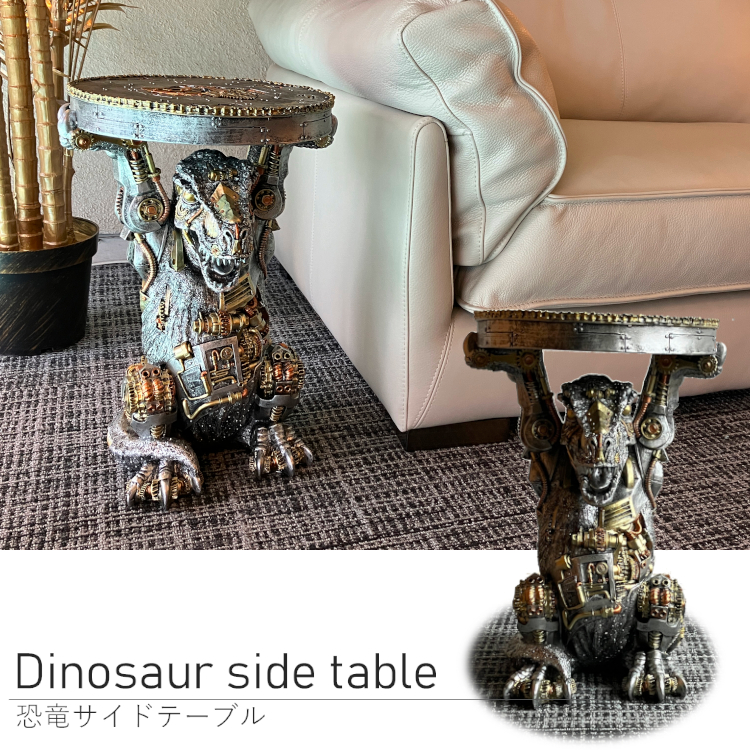 恐竜が天板を掲げる、楽しいデザインのサイドテーブル。よく見ると歯車やチェーン、ボルトなどのパーツをそこかしこに散りばめた、カッコいいテーブルです。ショップのディスプレイテーブルにもおすすめな個性的なアイテムです。