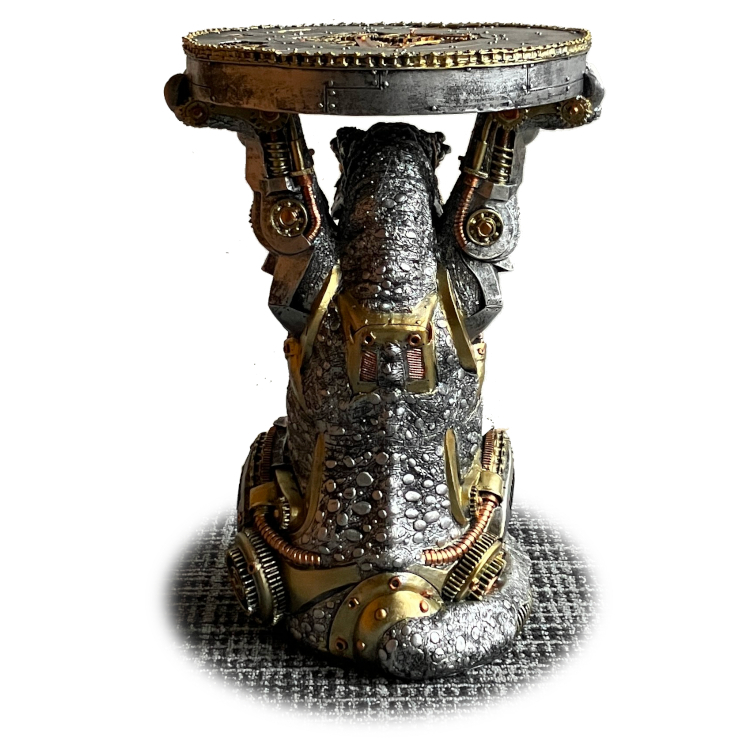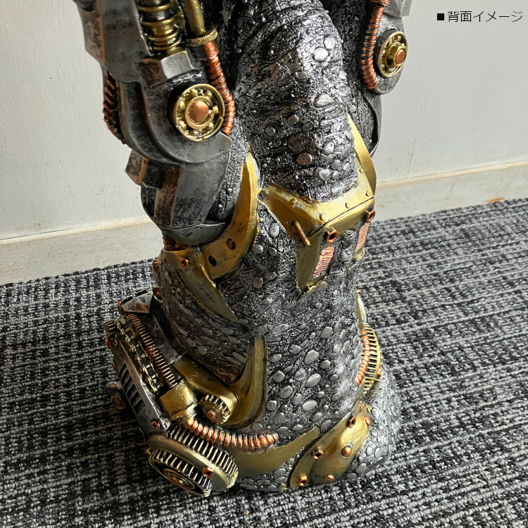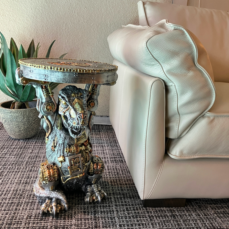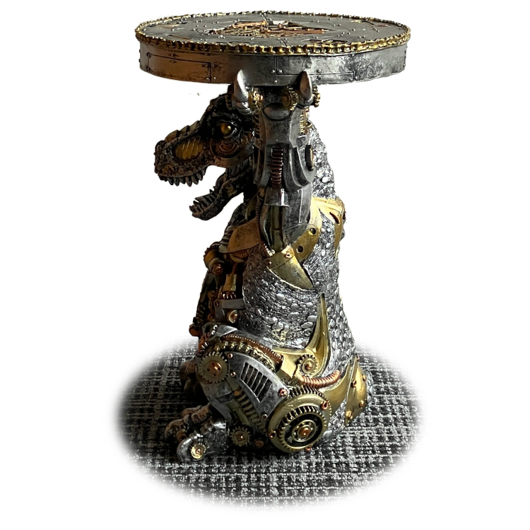 恐竜が天板を掲げる、楽しいデザインのサイドテーブル。よく見ると歯車やチェーン、ボルトなどのパーツをそこかしこに散りばめた、カッコいいテーブルです。ショップのディスプレイテーブルにもおすすめな個性的なアイテムです。