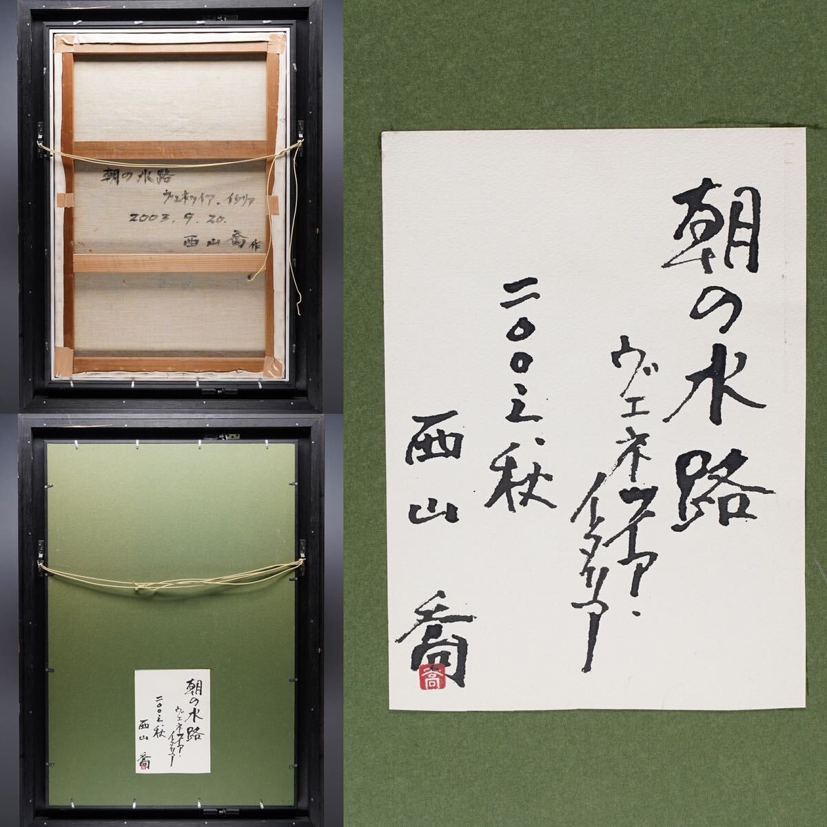 | 商品に興味をもっていただき、ありがとうございます。 以下お読みいただき、ご入札をお待ちしています。 作 者:西山喬 題 名:「朝の水路」 2003年制作 技 法:キャンバスに油彩 サイン:左下にあり サイズ:額:約80x110x7センチ 絵:約61x91センチ 作品状態:画面上にひび割れ、汚れなどがなく、かなりきれいな状態です。 額縁状態:全体的に良好な状態です。前面にアクリル板は装着してあります。 付属品:なし 詳しくは写真にて状態をよくご確認ください。 ■出品表示の状態は『絵』そのものに限り(額は除く)、現状のコンディションの優劣を表示しています。■ 金額に関わらずご落札された作品をプチプチで包んでしっかりとダンボール箱で発送いたします。(取扱注意、割れ物、下積厳禁、天地無用シールを使用) | |
