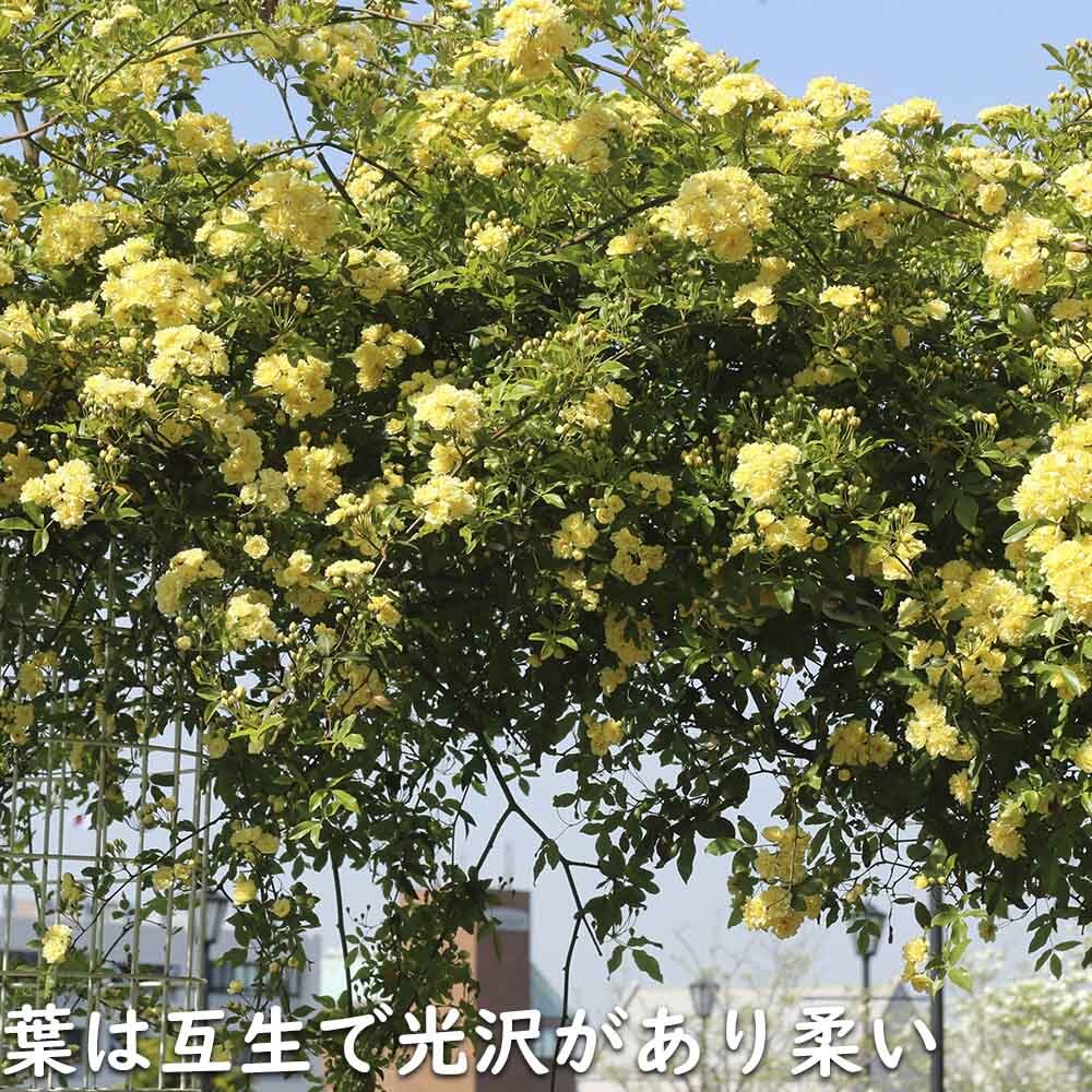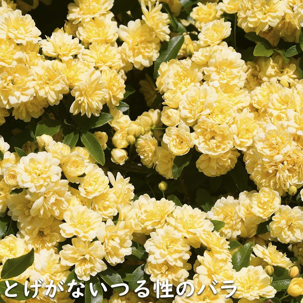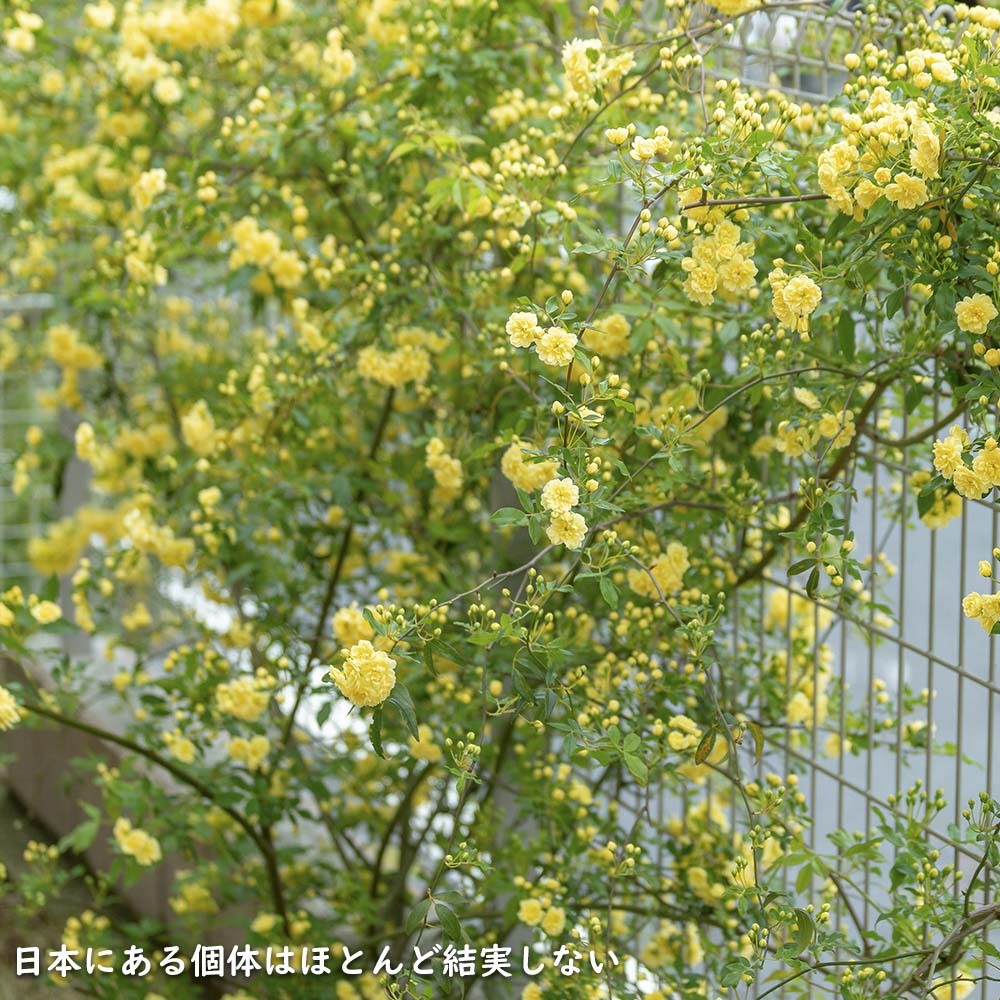 モッコウバラは7m程度まで成長する常緑つる性高木です。フェンスや塀などに誘引して這わせるのが一般的です。他のバラと比べてトゲがないのが特徴です。花は4~5月に咲きます。花は小さいですが数が多く見栄えがします。芳香はあまりしません。非常に剛健で病気に強いです。