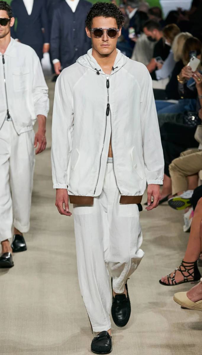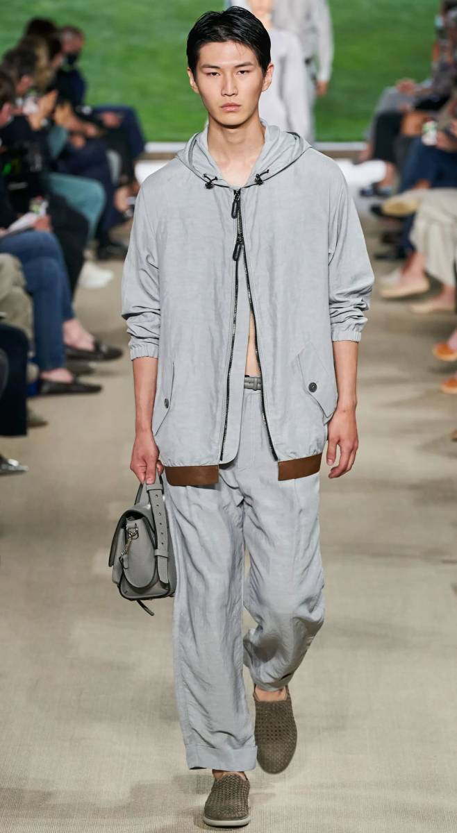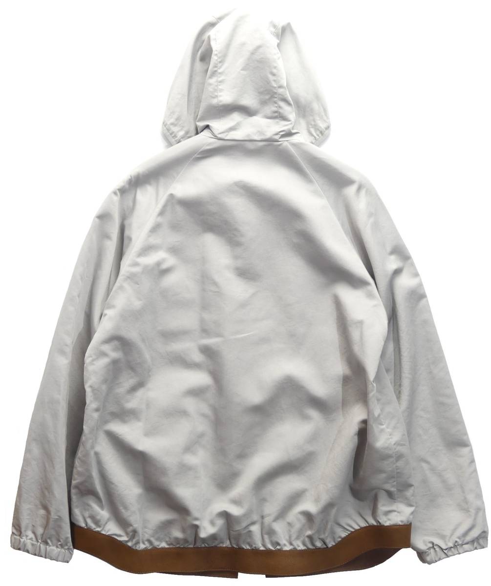 春夏向けのライトウエイトブルゾン。人気のフーディースタイルのジップアップタイプです。こちらはミラノコレクションのランウェイに登場した貴重なコレクションピース。ランウェイには今回出品のアイスグレーと、もう一つ白が登場しました。ブレザー丈くらいに少し着丈が長い作りと、裾にブラウンレザーを使っているところが特徴的。茶色の裾ラインで着丈の長さが強調されて、何となくルーズ感のあるリラックスした雰囲気です。シルク混紡のコットン生地は目の細かい高密度織りで、ほんのりではありますがピーチ質感。撥水加工が施されていますので、夕方に天気が不安定になりがちな春夏シーズンには快適に便利に着用できると思います。