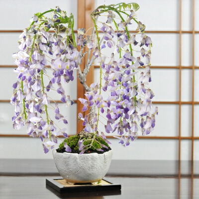 商品詳細 盆栽 藤 中サイズ 万古焼白5号丸形 藤盆栽 鉢植え 花盆栽 ギフト 贈り物 おしゃれ モダン インテリア 一才藤 鉢花 SPEC 樹高35cm×幅10cm 幅15cm×高さ7.5cm *写真は代表的なイメージ写真になります。お届けする盆栽は数量物の為、高さ、枝ぶり、鉢の種類が写真とは異なる場合がございます。 育て方冊子と肥料が付属しますので初心者でも安心です。電話・メールでのサポートもしております。 ラッピングは無料です。ご注文時にお申しつけ下さい。通常2営業日以内に発送致します。お急ぎの場合はご連絡下さい。土日祝日は発送お休みです。
