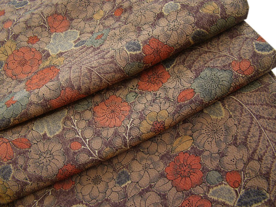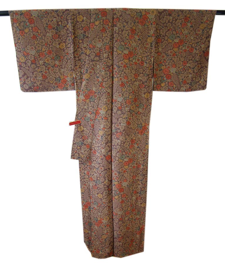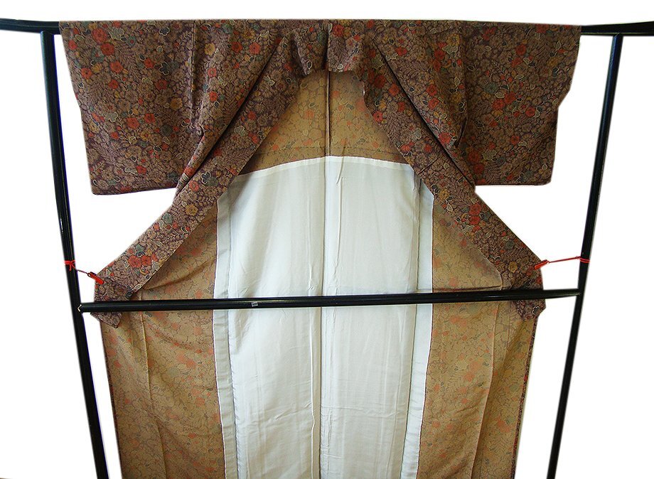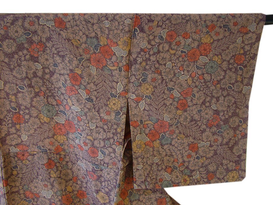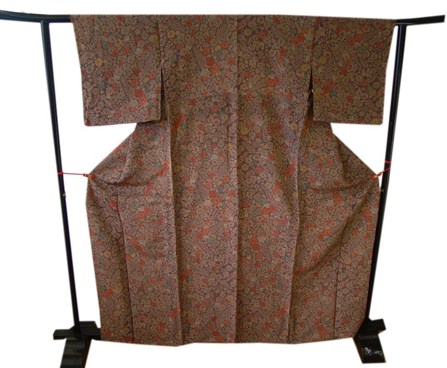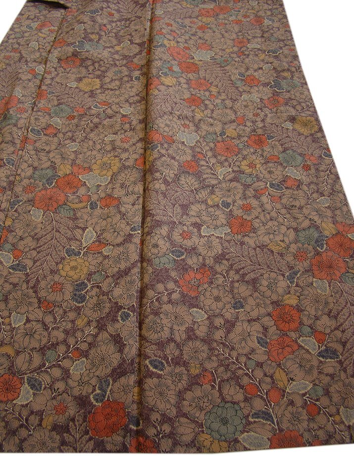 商品説明 | こちらのお品は「単衣」ですので5月、6月、9月にお召頂ければと思います。 着物には、大きく分けて「袷(あわせ)の着物」と「単衣(ひとえ)の着物」と「夏着物」があります。 反物(表地)を着物に仕立てるときに、裏地類をつけるものを袷の着物、 つけないものを単衣の着物と呼び、胴裏や八掛といった裏地がつかない一枚ものの着物です。 また裏地がないため、座る時などにヒップのラインが目立たないよう、 居敷当て(いしきあて)の生地をつけることもあります。 正絹の居敷当て付いております。 とてもしなやかなさらりとした滑らかな手触り良い重めの極上ちりめん地の生地、 渋い茶系地に柿茶、鼠色等の花草柄の染柄となっております。 |