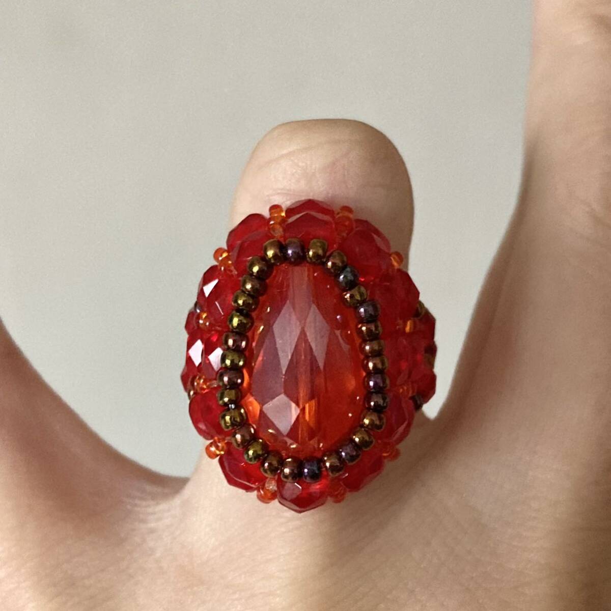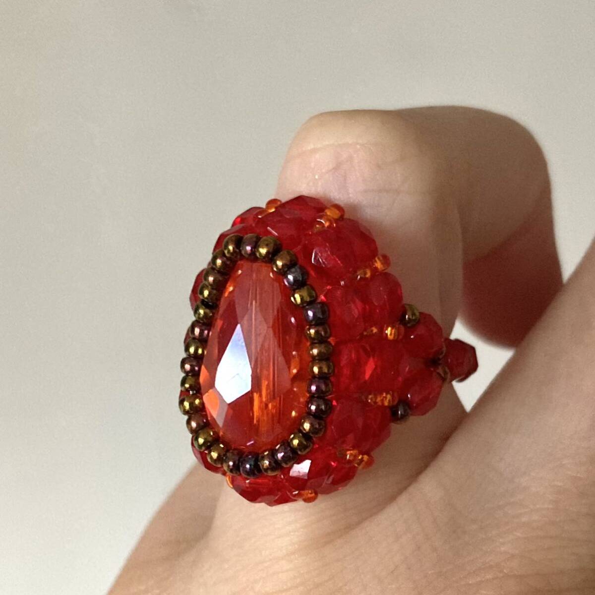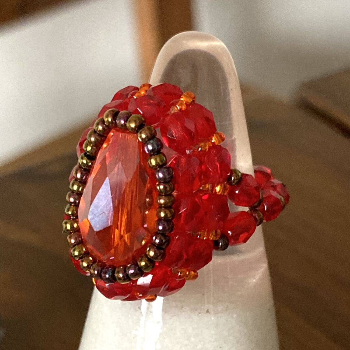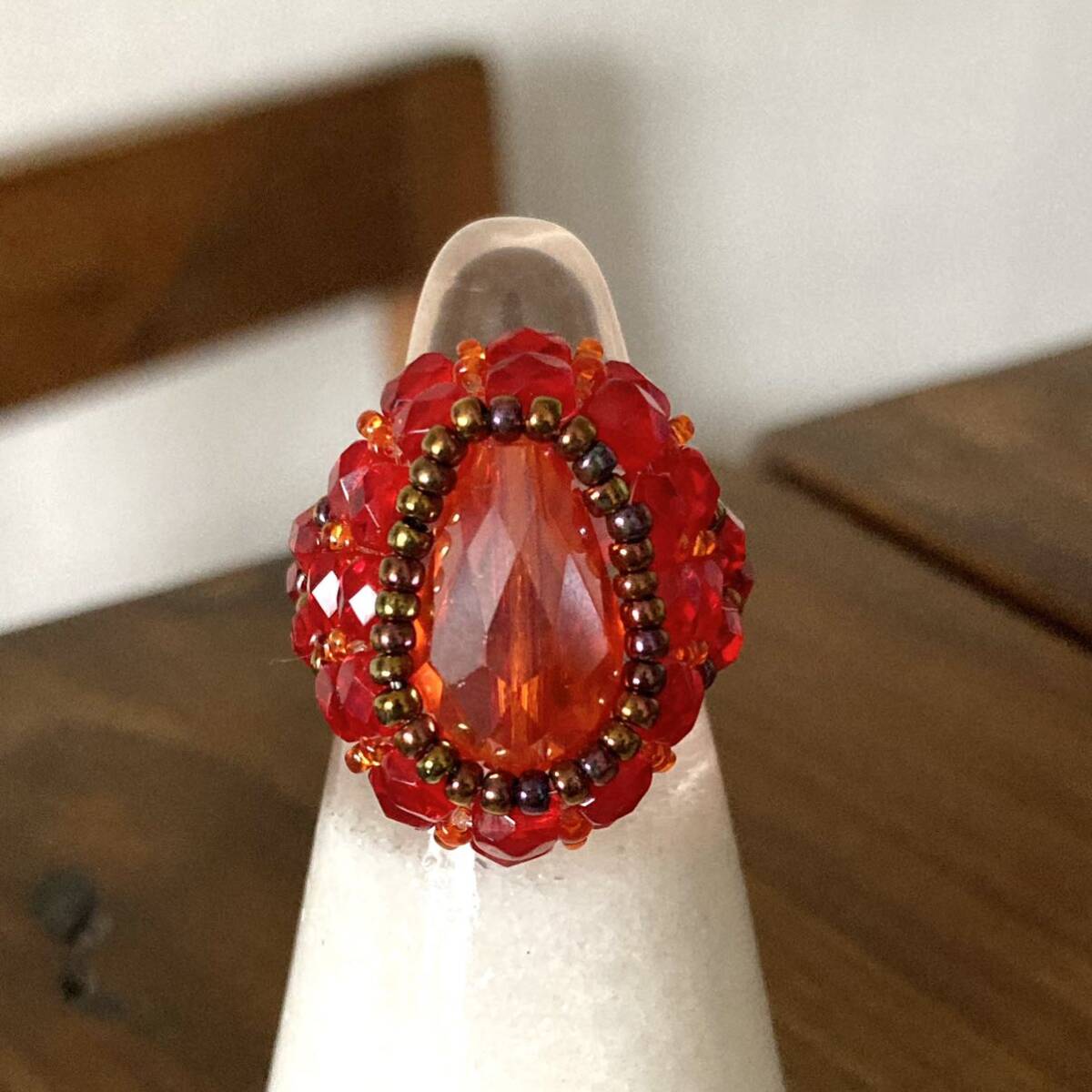 16mmのオレンジのドロップガラスビーズ、4mmの赤のチェコビーズ、オレンジ、ブロンズの丸小ビーズで作ったリングです。