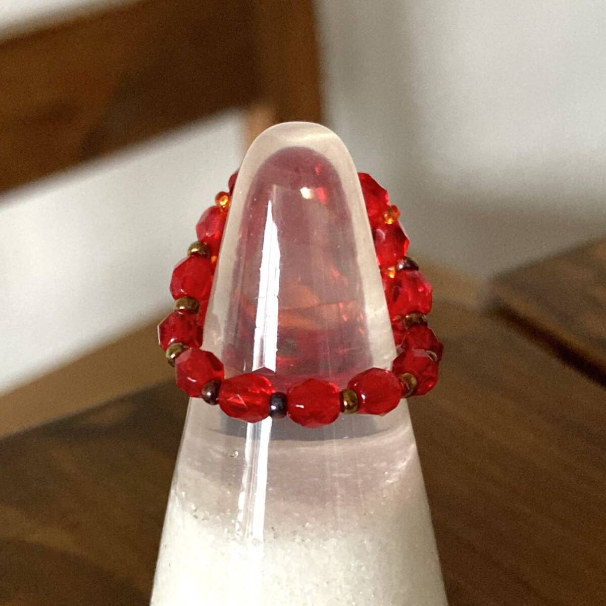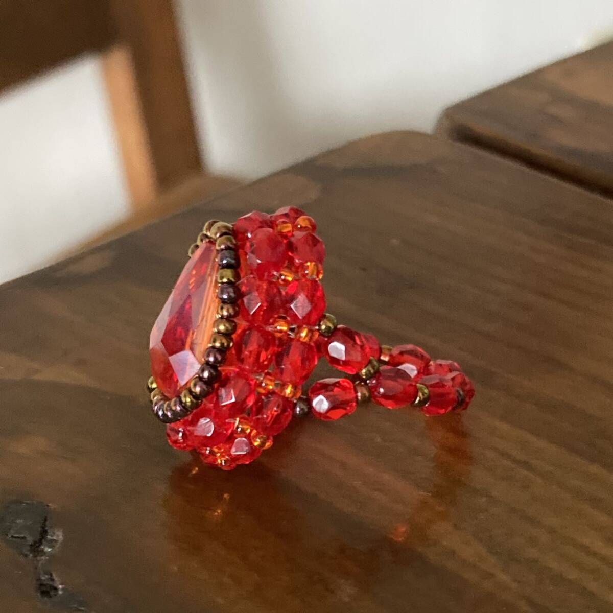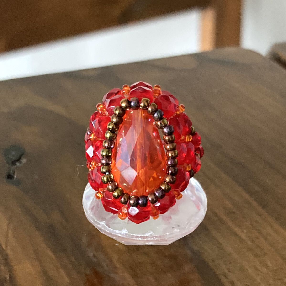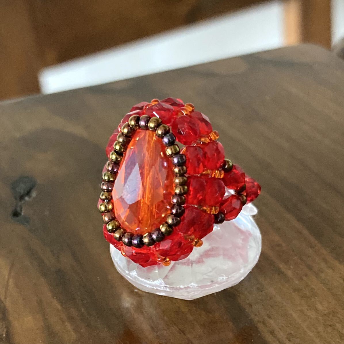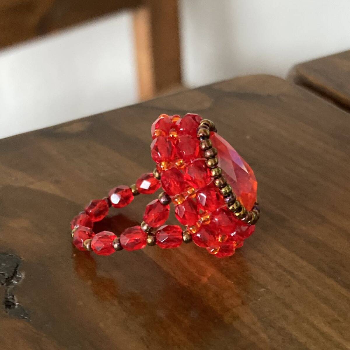 16mmのオレンジのドロップガラスビーズ、4mmの赤のチェコビーズ、オレンジ、ブロンズの丸小ビーズで作ったリングです。