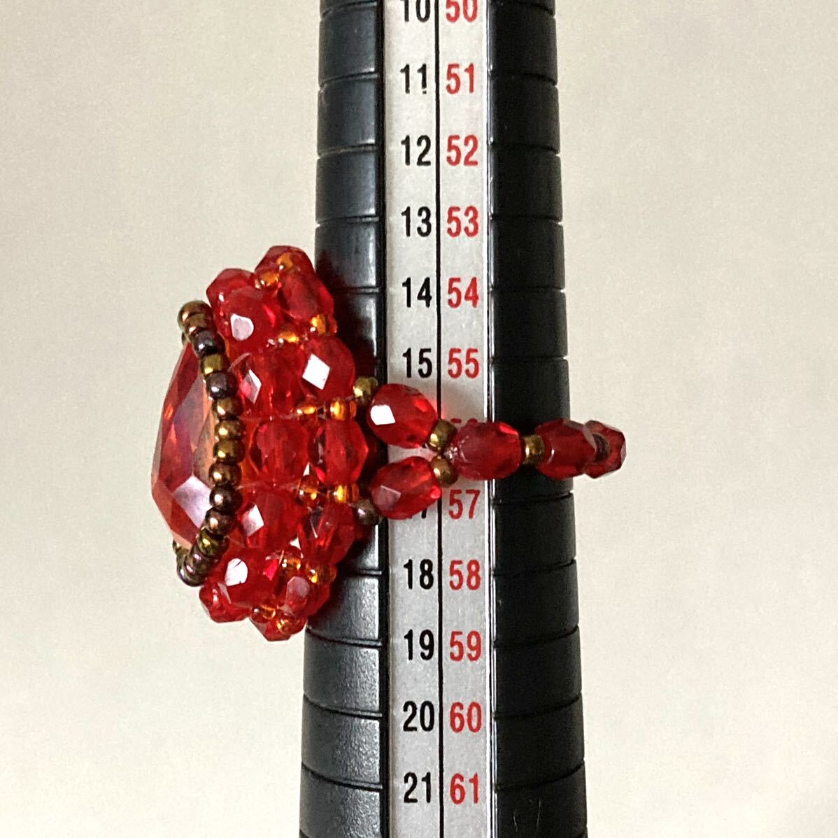 サイズは指周り約5.6cmです。(テグスなので前後します。)
