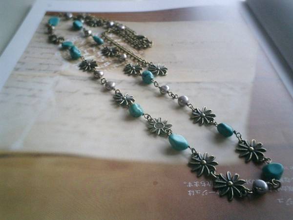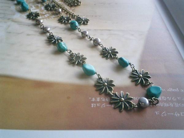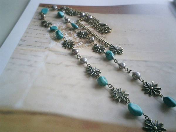 夏の色を探して・・シリーズです♪やさしい気持・・ターコイズとお花のチャームの可憐なネックレスです♪ターコイズは9ミリから11ミリ位のラフタンブルです♪13ミリ位のお花のメタルチャームやグレーパープルの淡水パールを合わせて大人のロマンチックしています♪長さは全長82センチ位で調節自由です♪2連にされても素敵です♪シンプルで合わせやすいデザインなので長く着けていただけると思います♪お揃いのブレスレットも出品しています♪ハンドメイドをご理解頂いてノークレーム、ノーリターンでお願いします♪