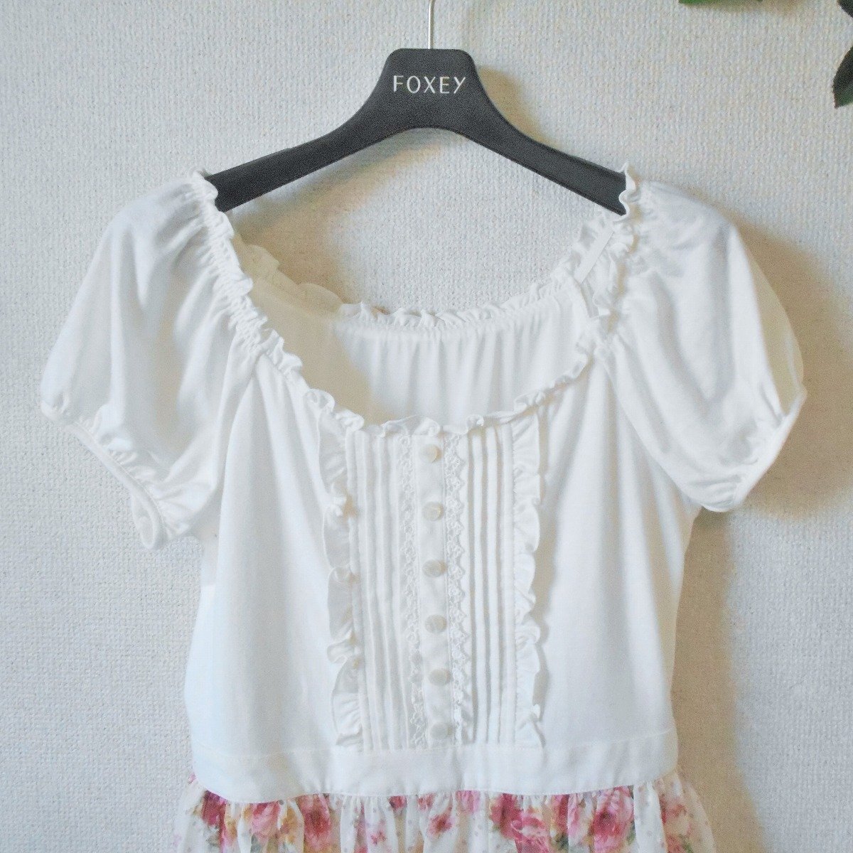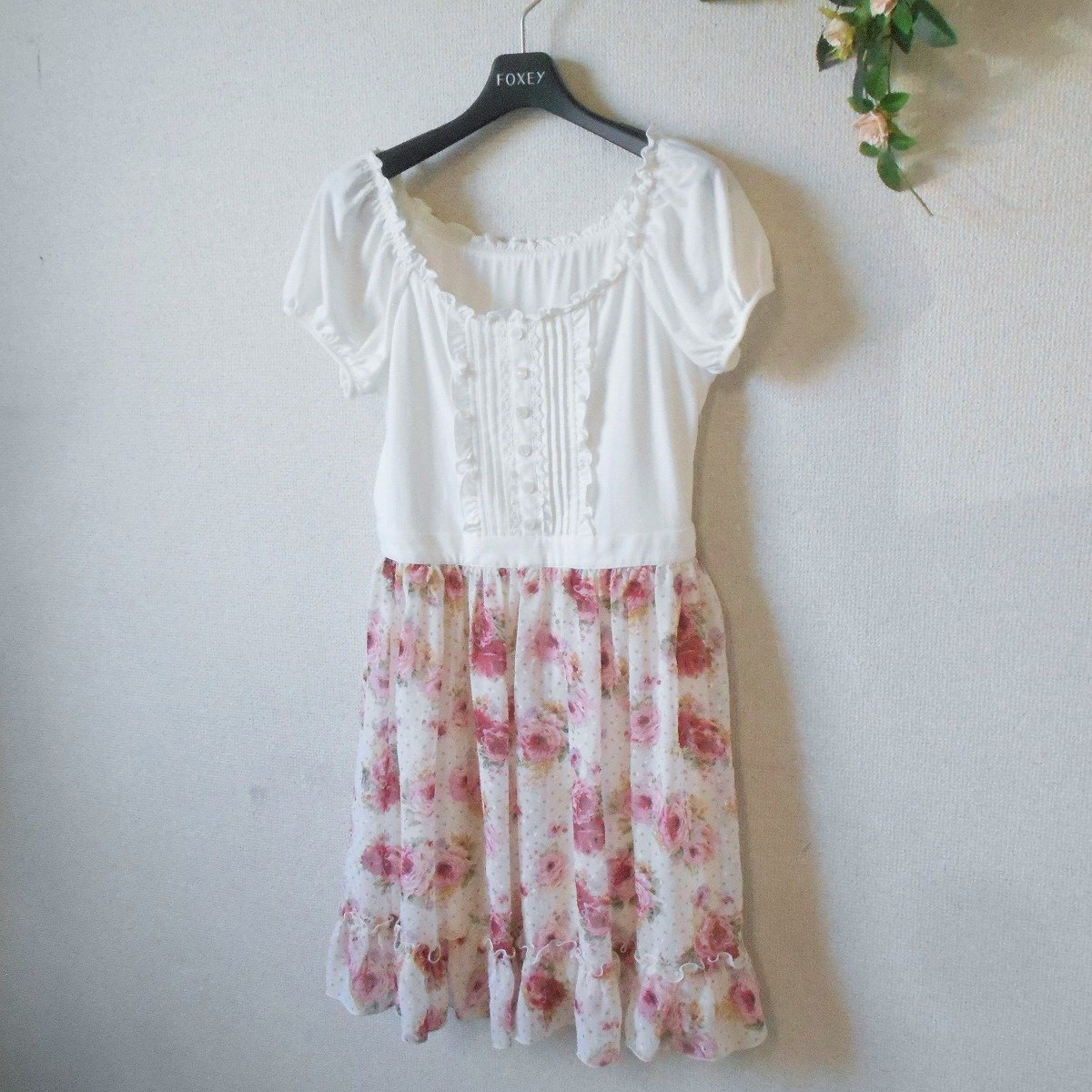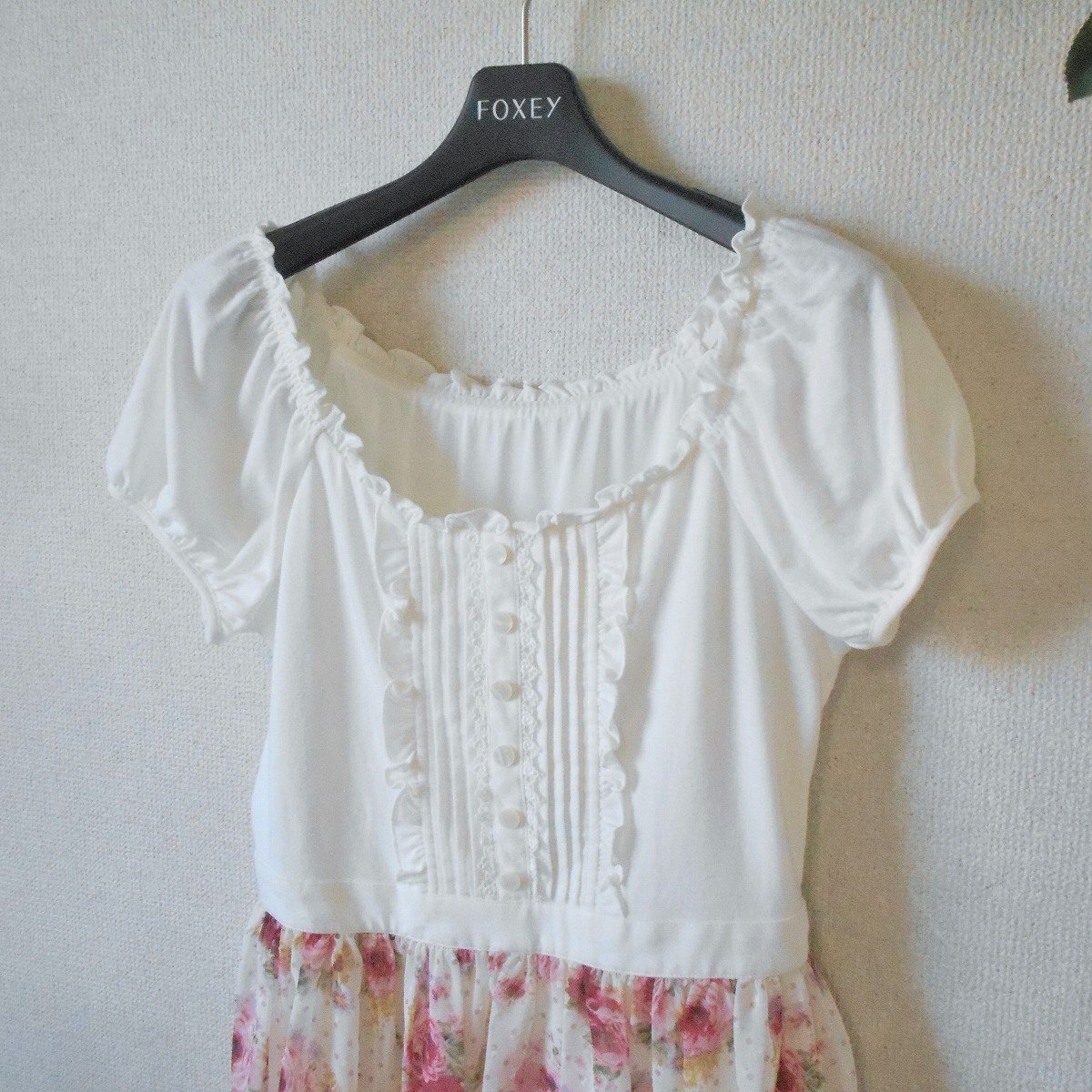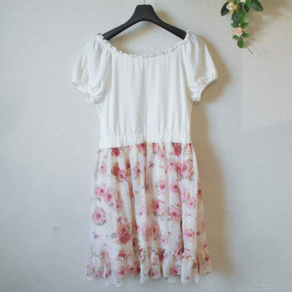 上部はオフホワイト、スカート部はシースルー生地に多色使用の花柄プリントが入っていて、上部はタックやフリルも使用されていて、とっても可愛い一着です。