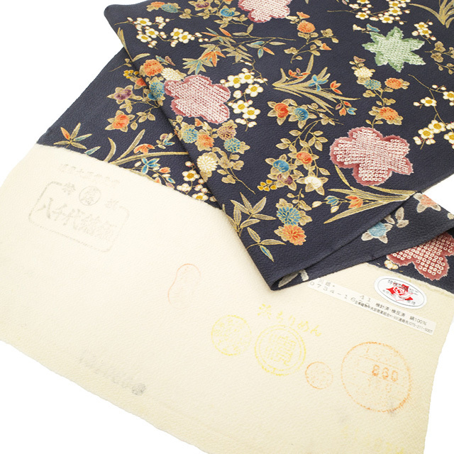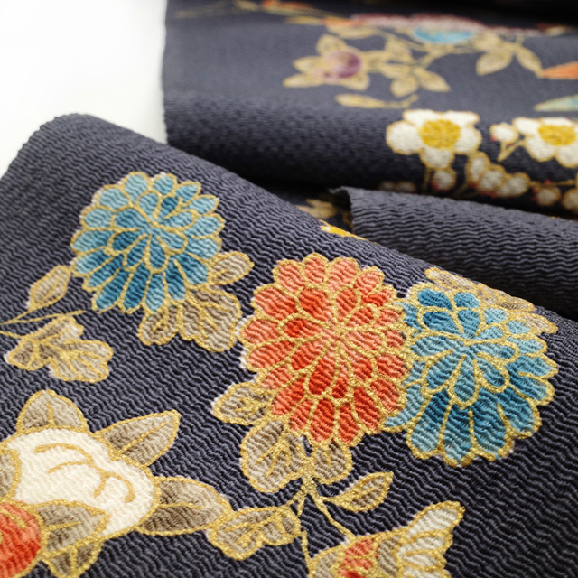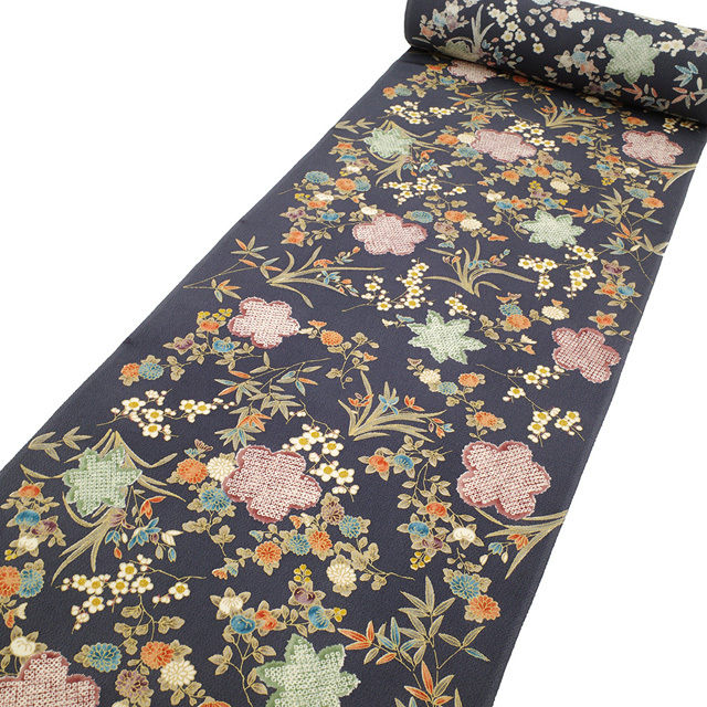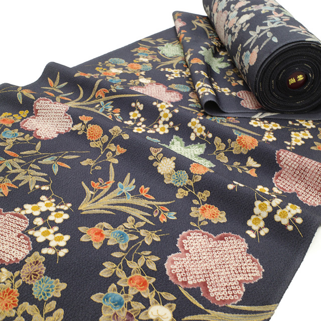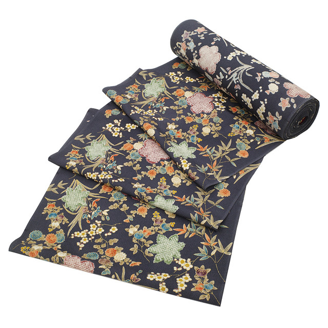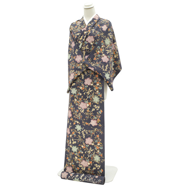 ほんのり青みを感じる濃グレーを基調に、様々なお色合いで橘・蘭・笹・紅葉・菊・梅などの四季の草花が丁寧に染められています。
