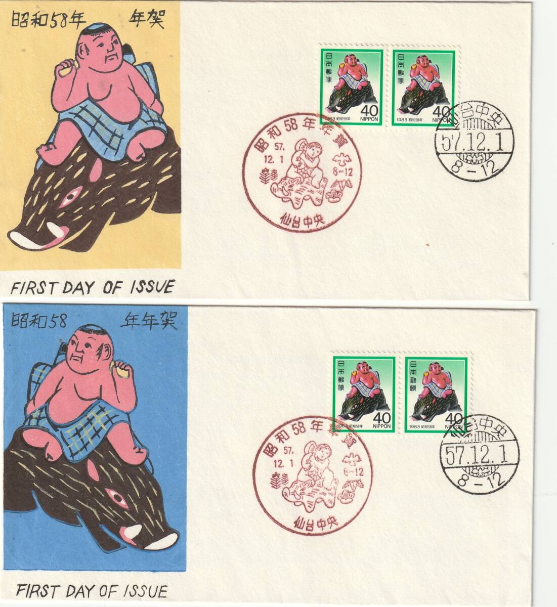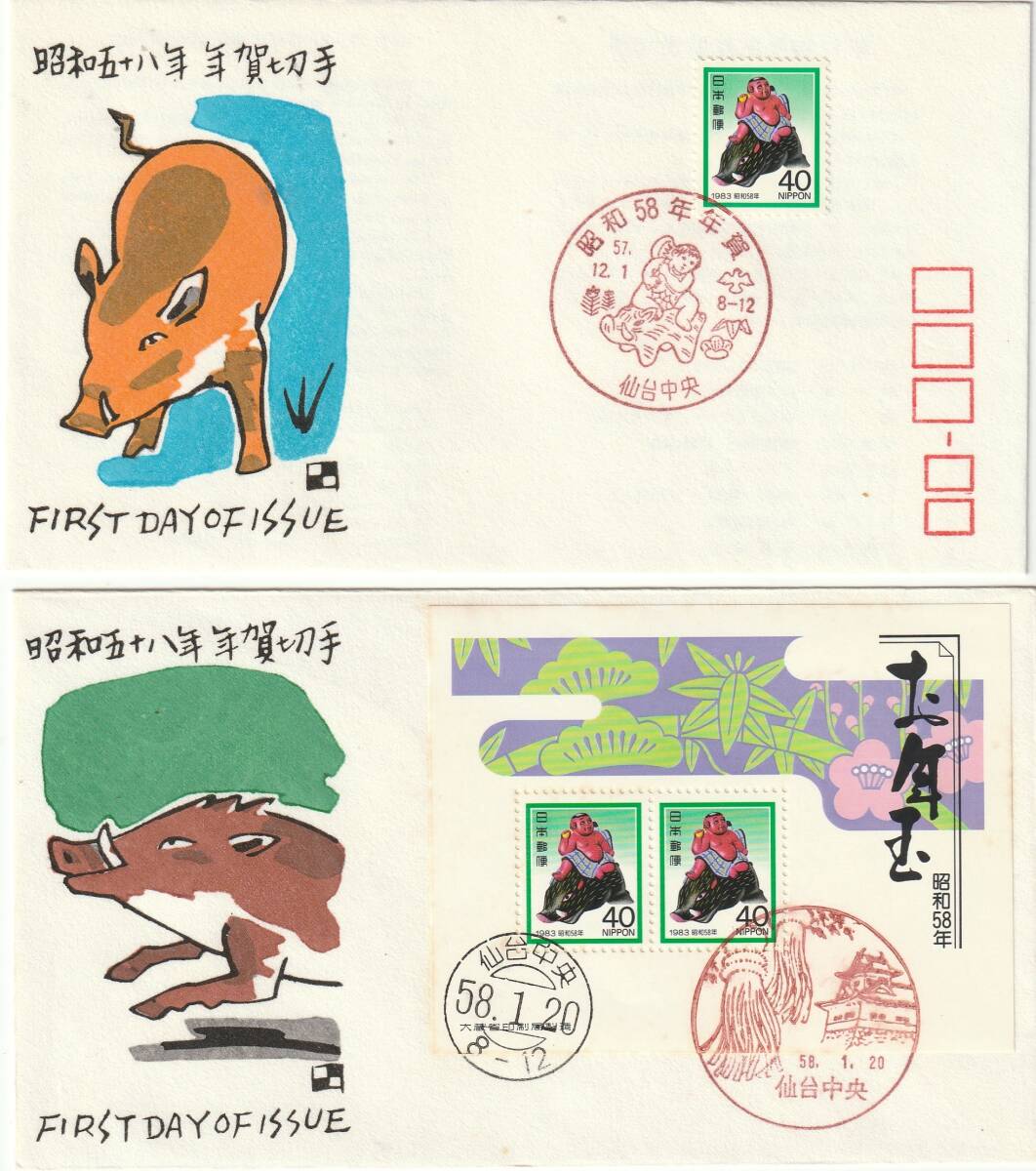 FDC 1983年  年賀切手ー年賀シート  いのしし  40円  4通  版元混合