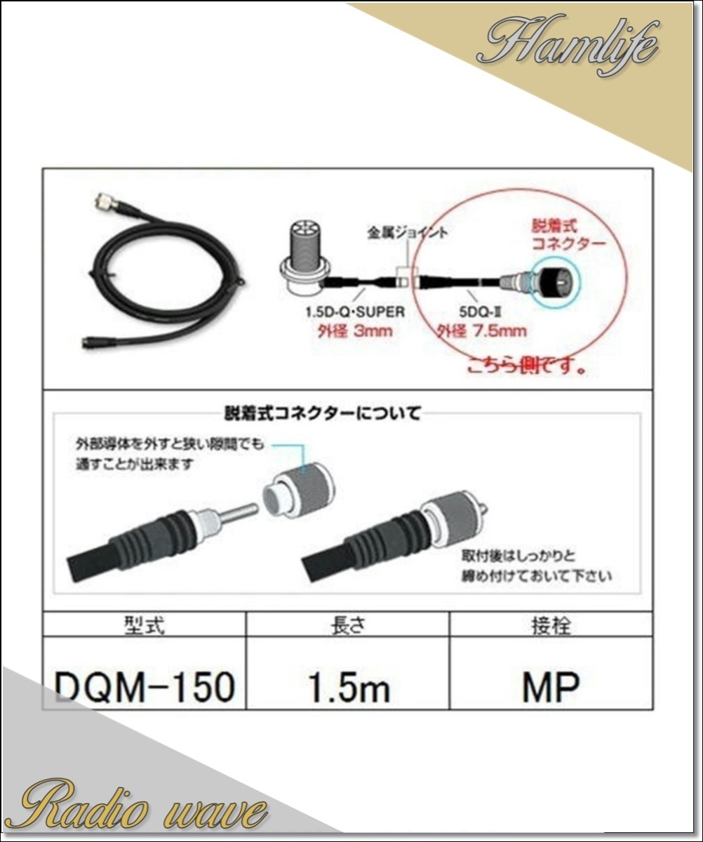 1.5m■専用オリジナルケーブル使用。■コネクターのセンターピンは24Kメッキ仕上げ。※アンテナ側ケーブルと無線機側ケーブルをセットでお使い下さい。(片側だけでは使えません)返品】 返品は、未開封、未使用の商品に限ります。 以下の場合は、返品、交換はお受けできません。 ◆使用後(開封後)の商品 ◆パッケージ(箱)、付属品等の欠品した商品 ◆お客様により、傷、汚れの発生及び破損してしまった商品 ◆加工品や取寄せ商品 ※またHF機、モービル機などは、発送後の返品はお受けできません。 お客様ご都合による返品については、送料、手数料共お客様のご負担となります。 【交換】 ◆初期不良の場合 初期不良の場合は、商品到着7日以内で下記までご連絡下さい。 〒514-0041 三重県津市八町2-1-4 tel 059-229-2737 (株)電化パーツ 津店 交換の際は、先に不良分の商品を送って頂きます(送料は当方負担)。 不良商品到着後、新品交換させて頂きます。 ※先に新品不良交換分はお送りできません。 ※全ての付属品が揃っている場合に限ります。1つでもかけている場合は交換できませのでご注意ください。 ※原則同商品と交換させていただきますが、生産完了などのため、在庫がない場合は、 修理対応となる場合もございます。 ◆お客様都合による交換(誤ってご注文など) 全ての付属品が揃っている場合に限ります。1つでもかけている場合は交換できませのでご注意ください。 送料はお客様のご負担となります。ご了承くださいませ。