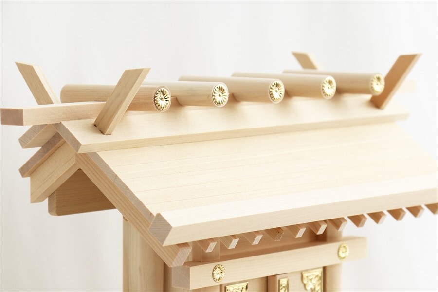 培われた木工技術をふんだんに盛り込んだ、「匠造り」シリーズの神棚。職人の技を集約した、工房手作りの逸品。 木曽桧材の美しい木肌と繊細な組み上げにより、とても上品で高貴な雰囲気です。「尾州桧」「官材」等とも呼ばれる希少な木曽ひのき材は、神棚用としては最高級品のみに使用されます。 板葺き屋根と大きい「千木」の基本型の美しさに加えて、力強く支える丸柱が特徴的な落ち着いたお社です。手の込んだ細微な加工が施されています。 | |||