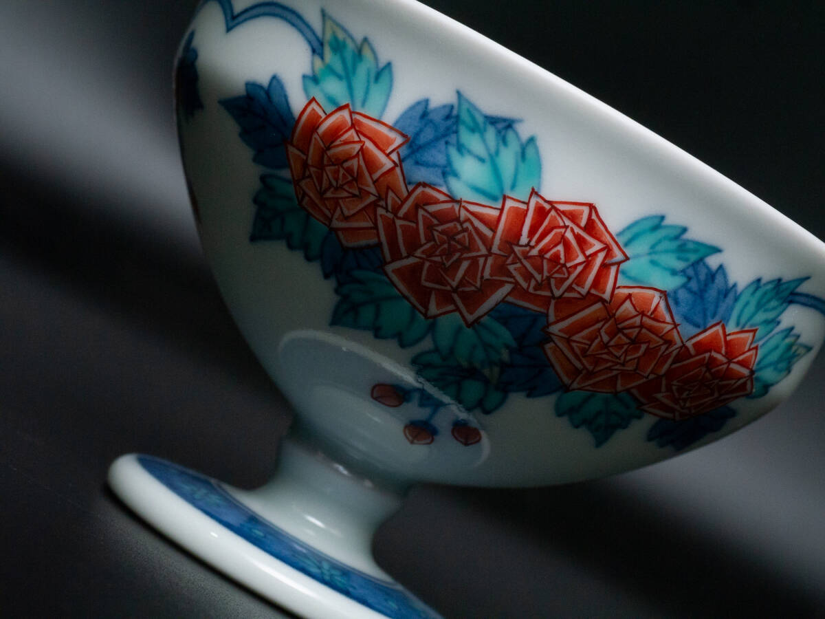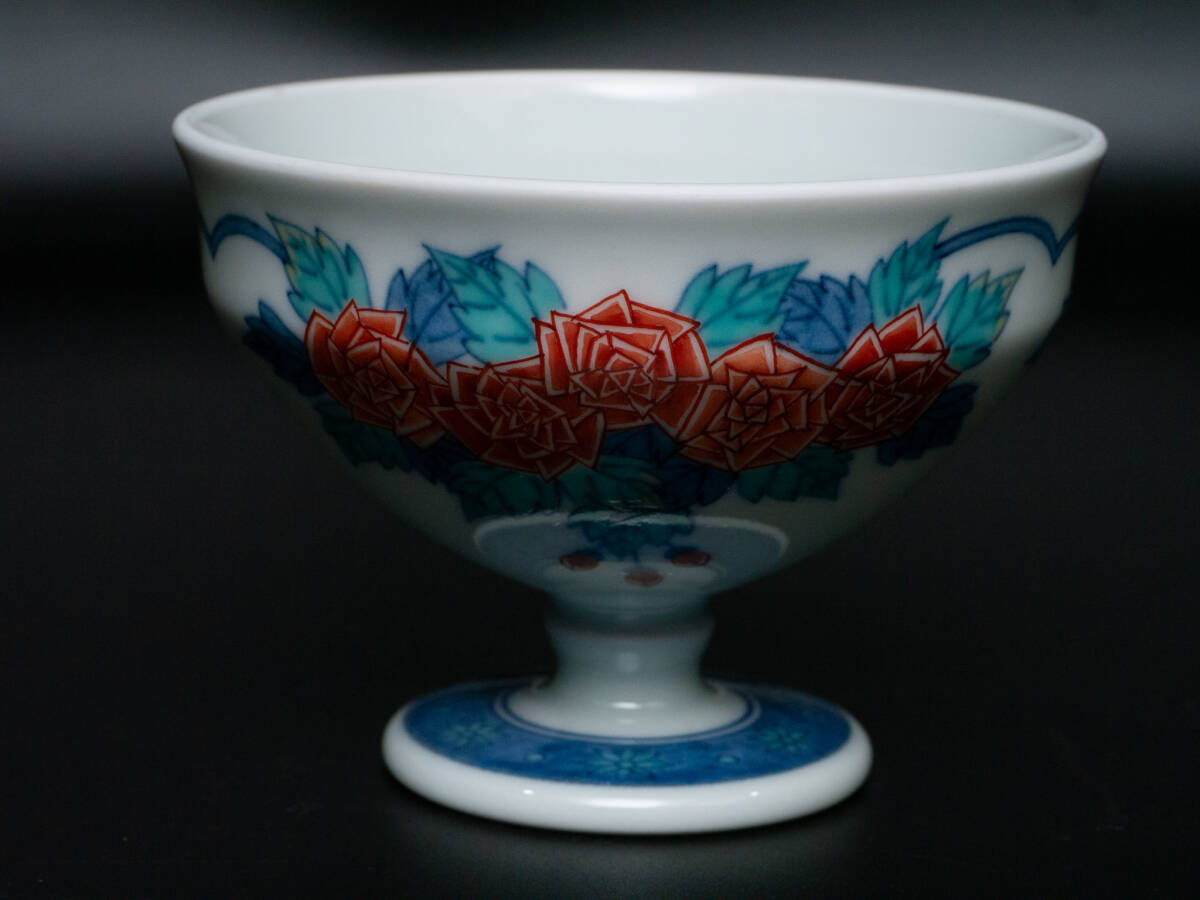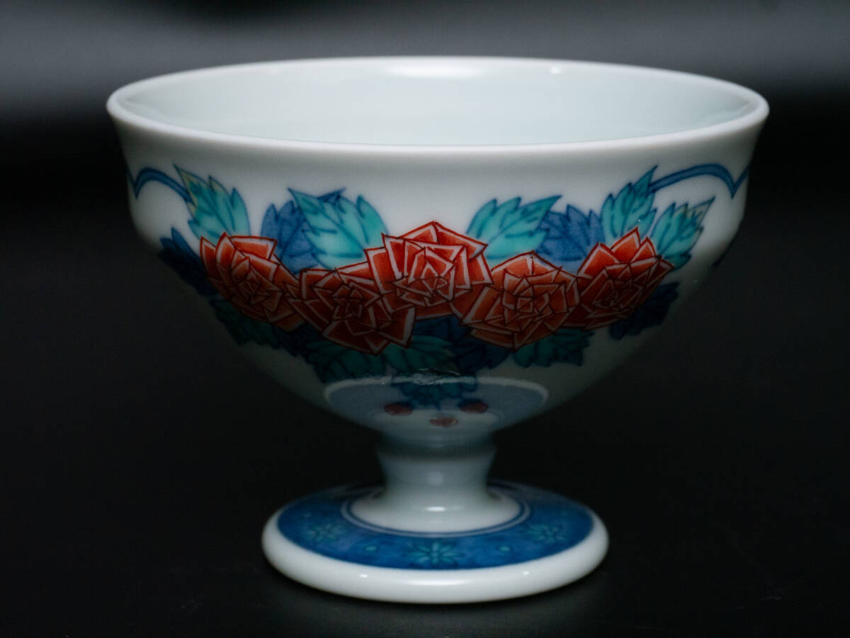 【値下げ交渉有り】 人間国宝 今泉今右衛門 本人作 色鍋島 バラ 薔薇文 高杯 盃 カップ 五客 化粧箱
