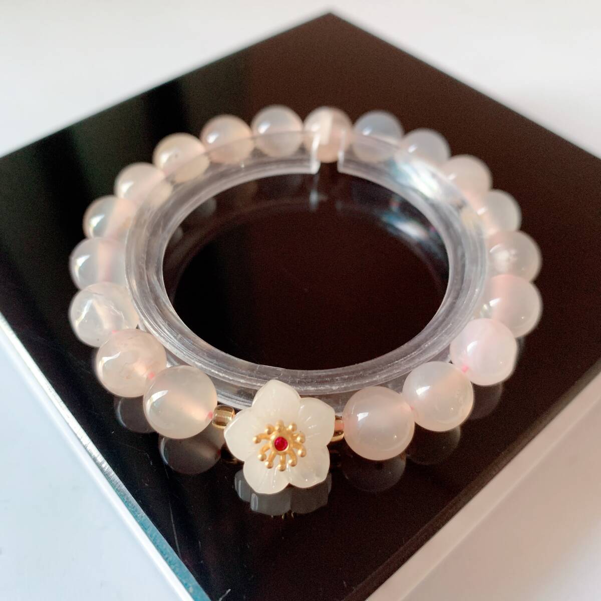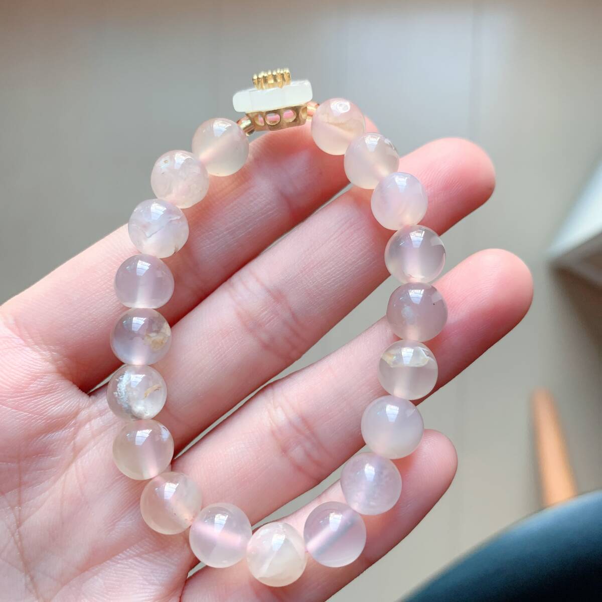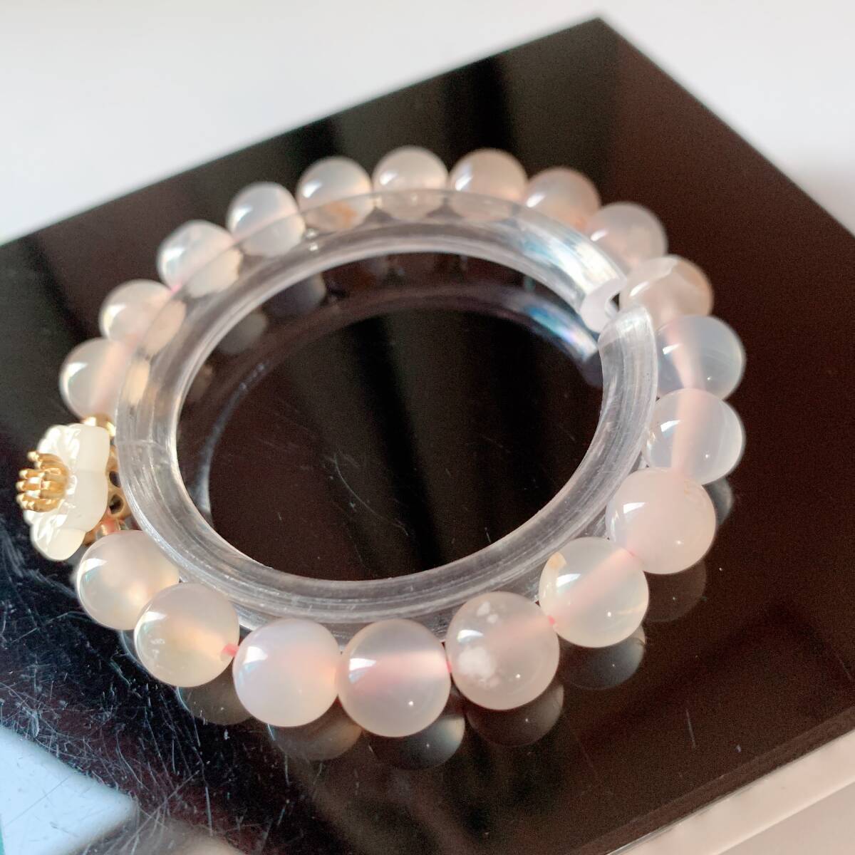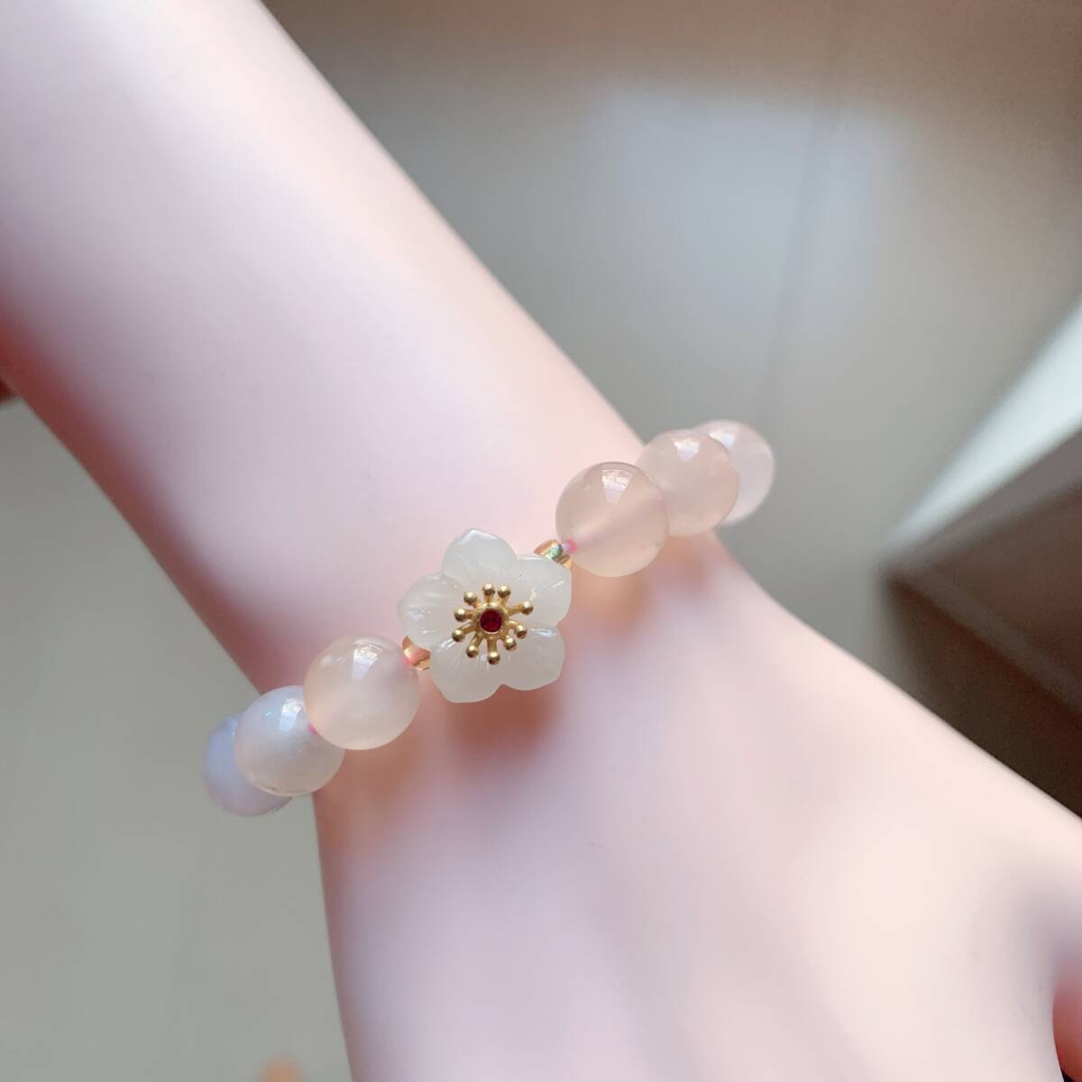 淡い透明感のあるピンクのアゲードの中にまるで桜の花が咲いてるかのように見えるパワーストーンです