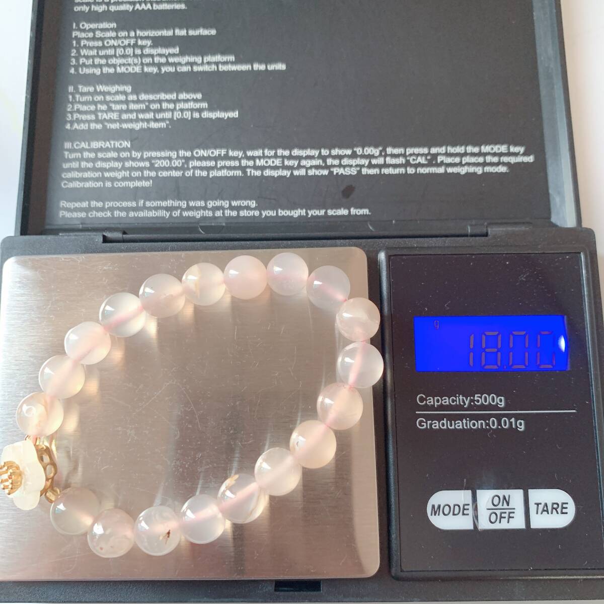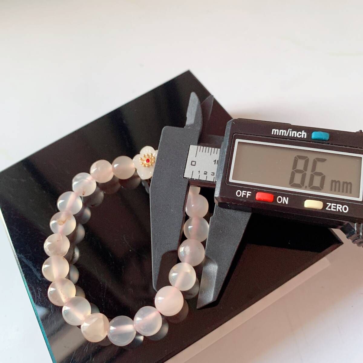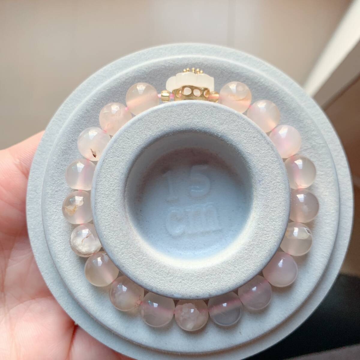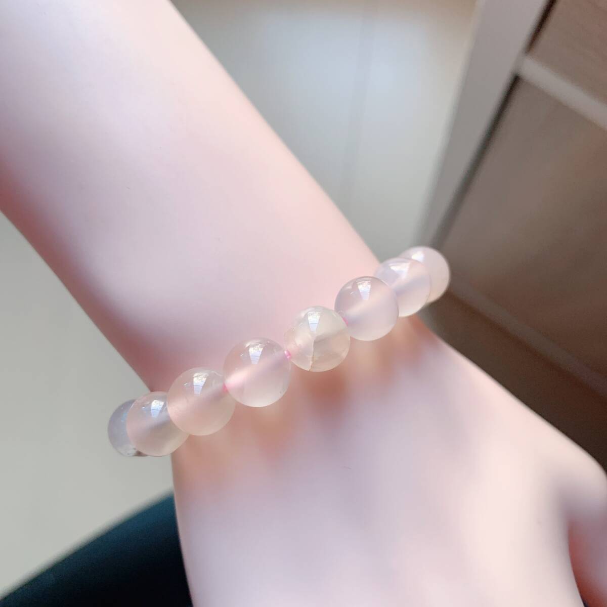 淡い透明感のあるピンクのアゲードの中にまるで桜の花が咲いてるかのように見えるパワーストーンです