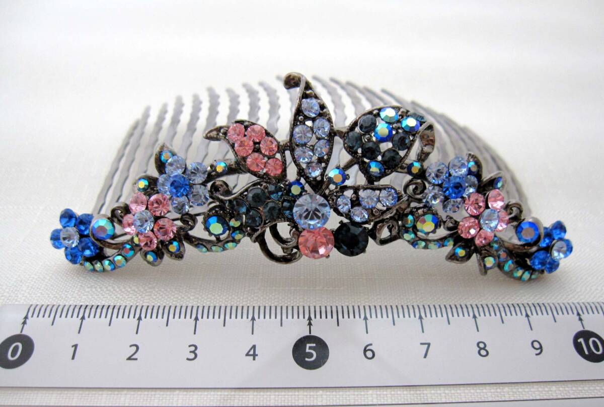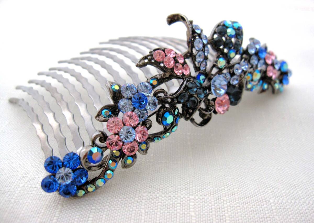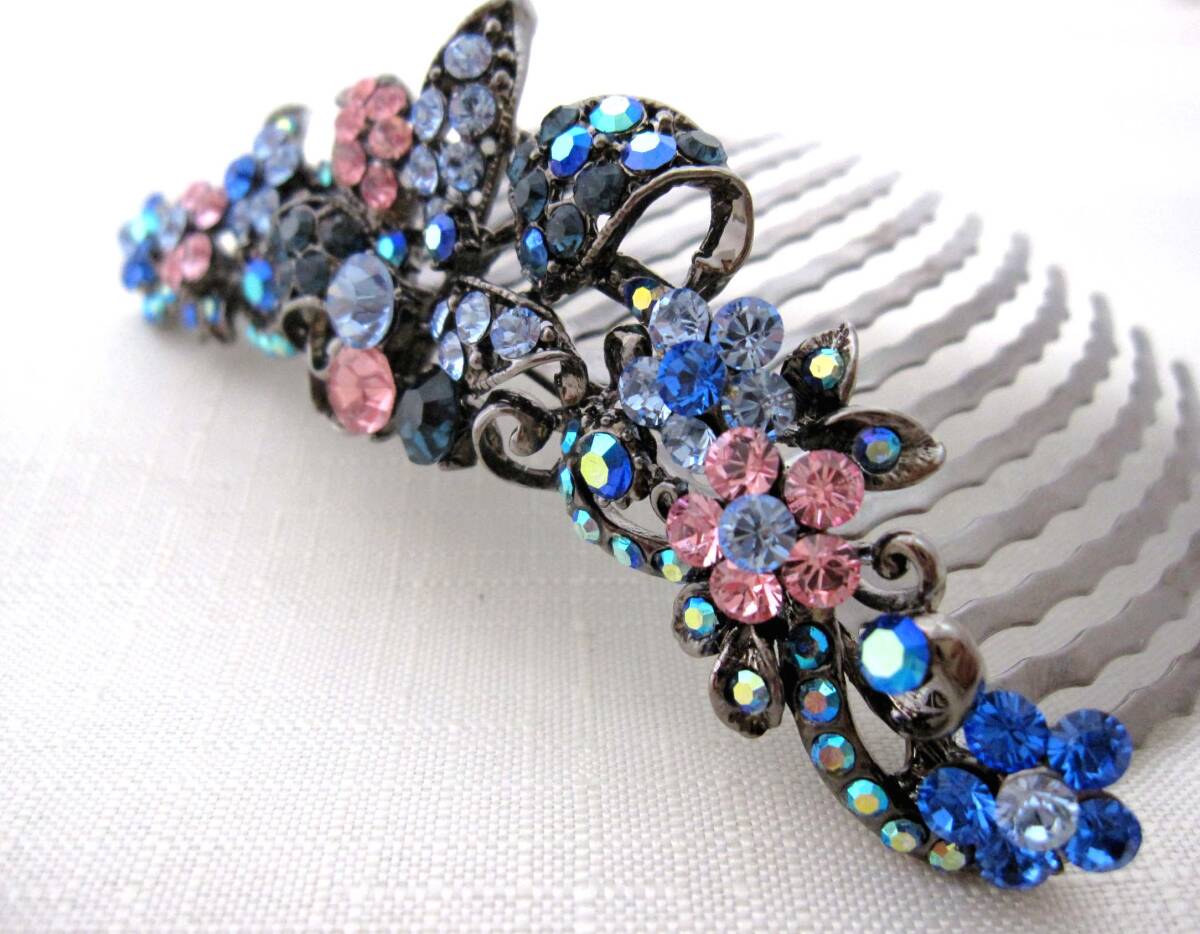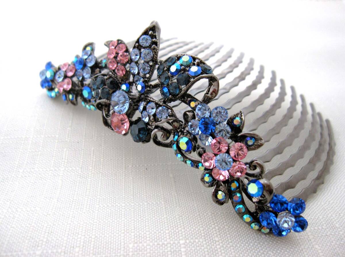 美品 夜会巻きコーム ブルー系 ヘアアクセサリー*髪飾り*和装*女子会*スワロ*発表会*ティアラ<210923-3>