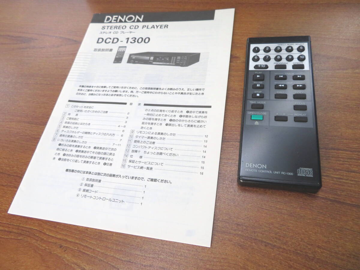 DENON製CDプレーヤー DCD-1300 です。リモコン RC-1300 及び当時の取扱説明書も付属します。リモコンも含めて本体動作問題ありません。大事にしておりましたので、天板にうっすら汚れ他小傷少々ありますが外観も当時のものとしては良い状態かと思います。■佐川便送料元払いにて発送いたします。■送料2500円 中部・東海 (静岡、愛知、岐阜、三重、富山、石川、福井)・関西(滋賀、京都、大阪、兵庫、奈良、和歌山) / 2800円 関東・信越 (茨城、栃木、群馬、埼玉、千葉、東京、神奈川、山梨、新潟、長野) / 2800円中国(鳥取、岡山、島根、広島、山口)・四国(香川、徳島、愛媛、高知) / 3000円 九州 (福岡、佐賀、長崎、熊本、大分、宮崎、鹿児島)・東北(青森、岩手、秋田、山形、宮城、福島) / 3500円 北海道 (離島、沖縄は発送できません。)■祝日、日曜日は発送ができませんのでご了承下さい。当日、15時までのご決済確認で翌日発送となります 。■トラブル防止のため新規IDの方のご入札は固くお断りします。万一、入札、落札された場合でも即時「入札取り消し」または「落札者削除」とさせて頂きますので何卒ご了承下さい。■領収書の発行はしておりませんのでよろしくお願い致します。